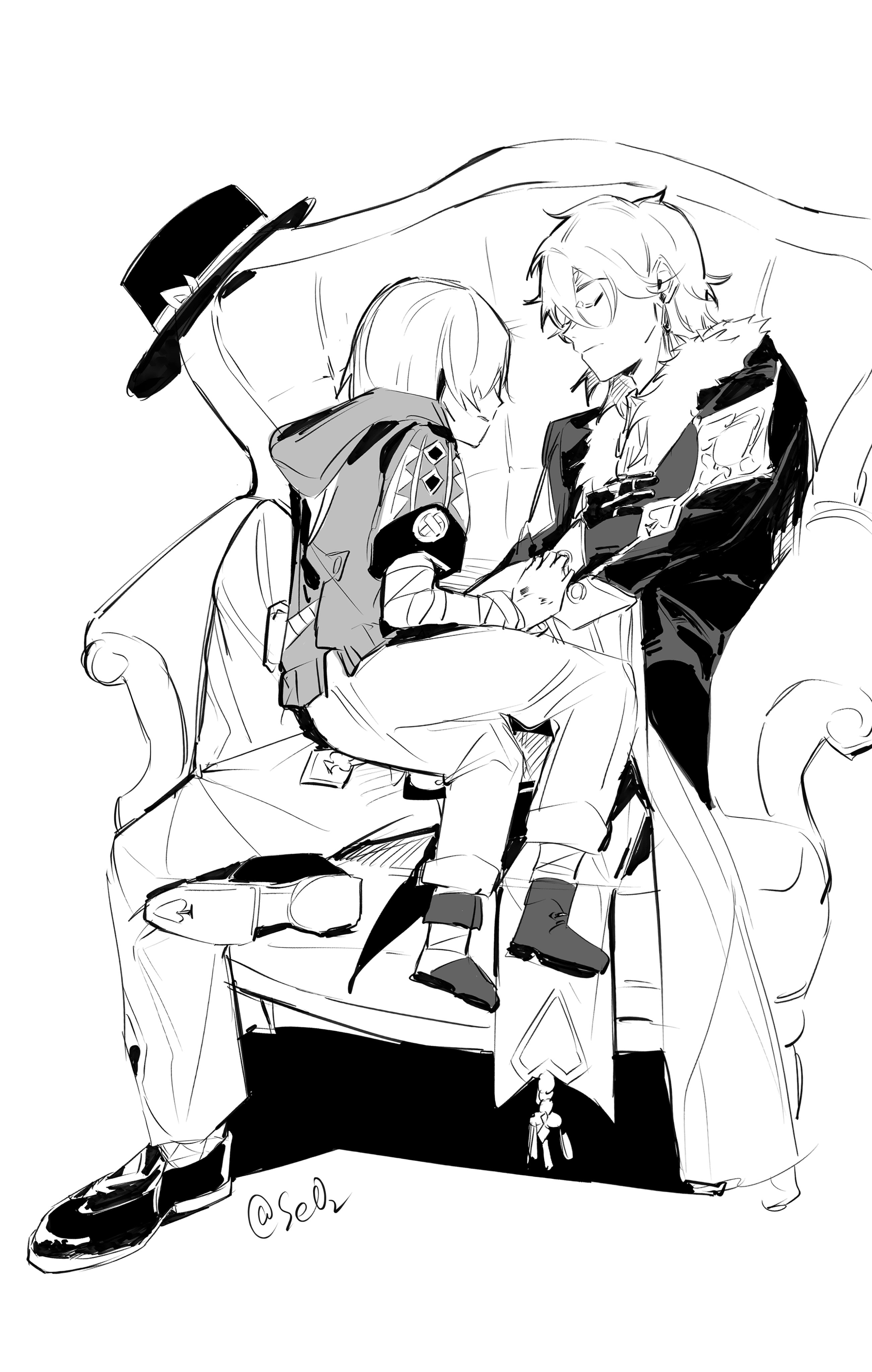 2boys absurdres aged_down aventurine_(honkai:_star_rail) bandaged_arm bandages closed_eyes couch fur_trim greyscale hat highres honkai:_star_rail honkai_(series) kakavasha_(honkai:_star_rail) male_focus monochrome multiple_boys seo2_aventurine shoes short_hair simple_background sitting sleeping unworn_headwear