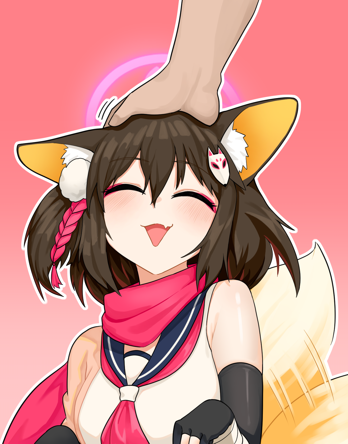 1girl :d ^_^ animal_ear_fluff animal_ears bare_shoulders black_hair blue_archive closed_eyes commentary_request eyeshadow fang fingerless_gloves fox_ears fox_girl fox_hair_ornament fox_tail gloves gradient_background hair_between_eyes hair_ornament halo happy headpat highres izuna_(blue_archive) japanese_clothes kodineun_haengbokhada long_sleeves looking_at_viewer makeup medium_hair motion_lines no_nose one_side_up open_mouth out_of_frame outline paw_pose pink_background pom_pom_(clothes) pom_pom_hair_ornament pov pov_crotch red_eyeshadow rope school_uniform serafuku shimenawa shirt sidelocks simple_background skindentation sleeveless sleeveless_shirt smile stranger_mukou_hadan tail tail_wagging white_outline white_serafuku wide_sleeves