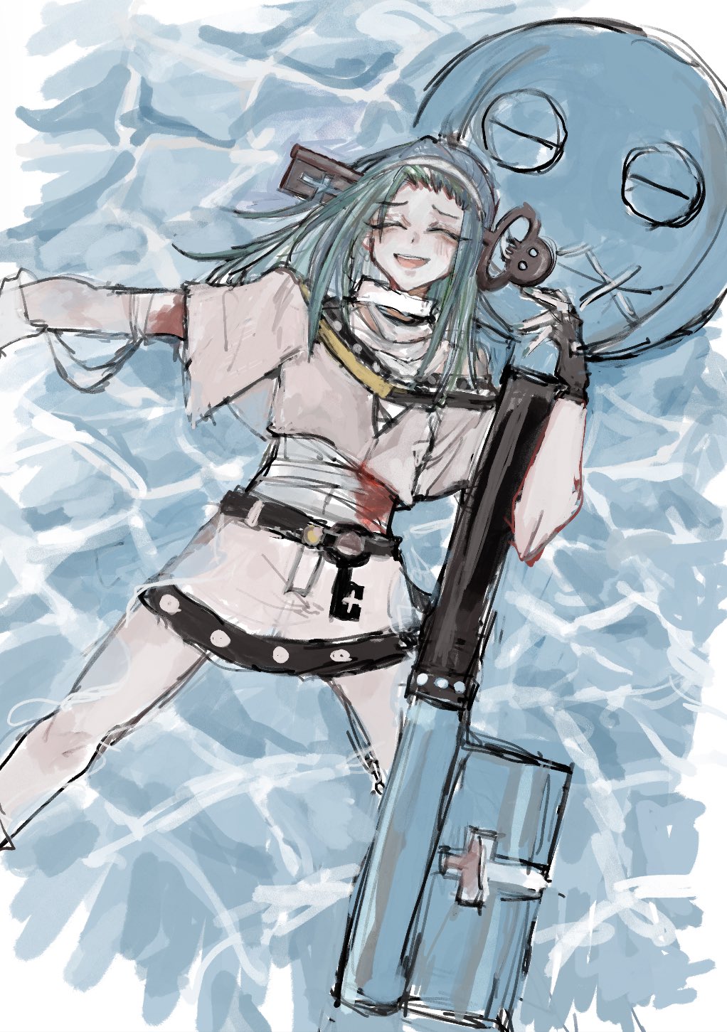 a.b.a arm_around_another bandages blood closed_eyes green_hair green_nails guilty_gear guilty_gear_strive highres legs_apart open_mouth paracelsus_(guilty_gear) skirt smile