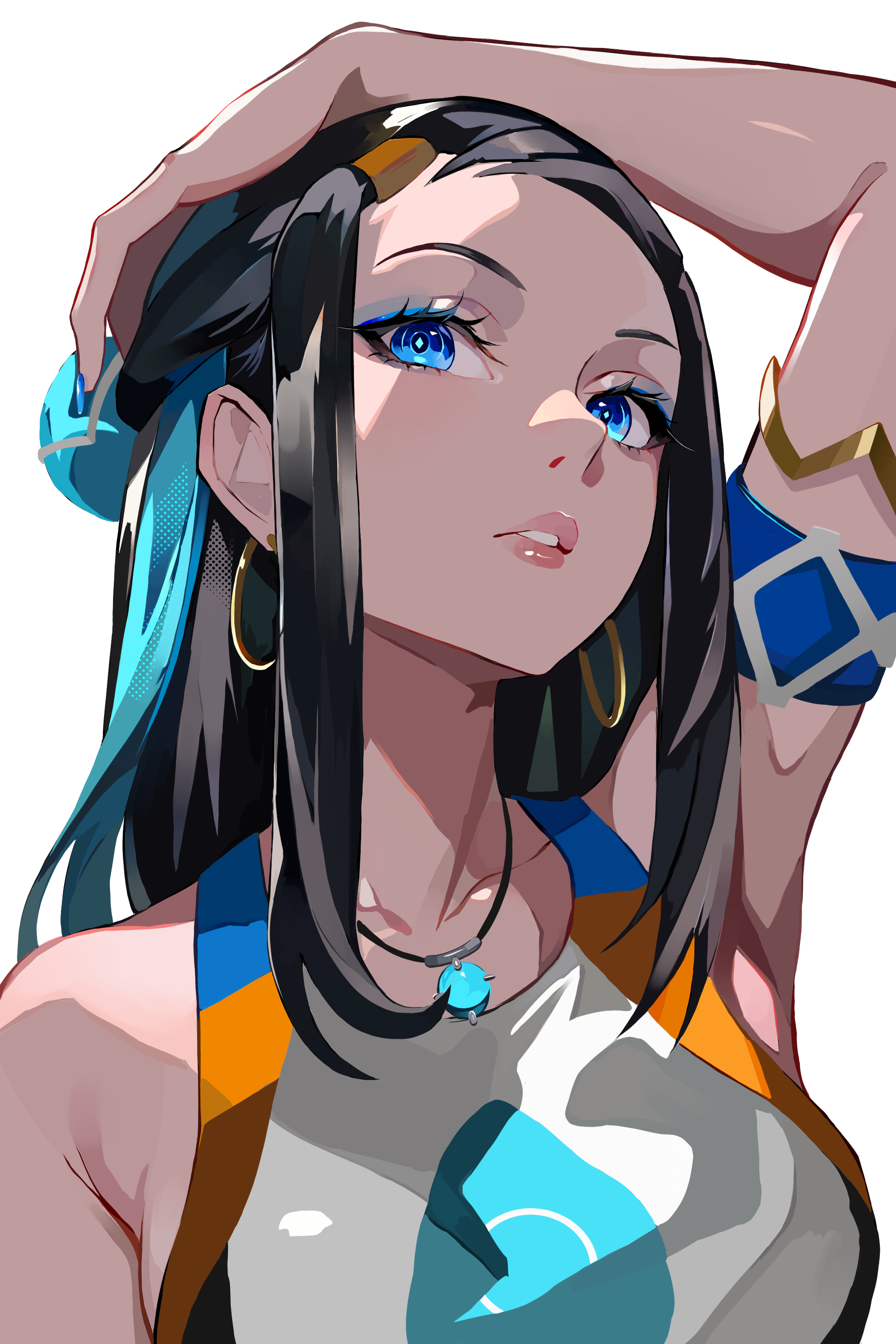 1girl absurdres alternate_skin_color aqua_hair arm_up armlet black_hair blue_eyes blue_eyeshadow commentary eyelashes eyeshadow hair_bun highres jewelry lightened_skin long_hair makeup multicolored_hair necklace nessa_(pokemon) nintendo parted_lips pokemon pokemon_sword_and_shield shirt sidelocks sleeveless sleeveless_shirt solo tor_(torkrub111) two-tone_hair untranslatable_commentary upper_body white_background
