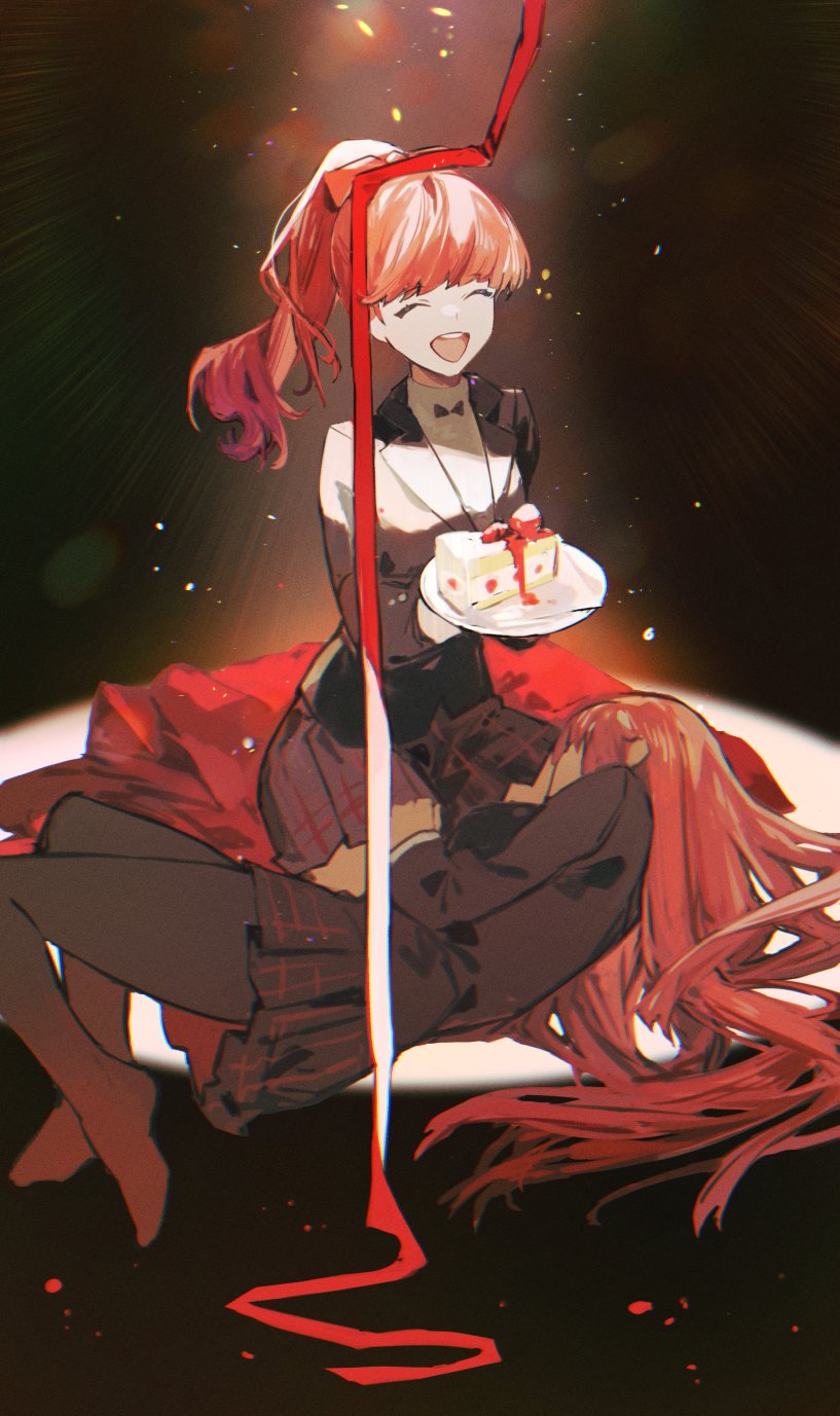 2girls black_jacket black_pantyhose cake cake_slice closed_eyes commentary dual_persona english_commentary food hair_ribbon hair_spread_out highres holding holding_plate jacket long_hair lying miniskirt multiple_girls open_mouth pantyhose persona persona_5 persona_5_the_royal plaid_clothes plaid_skirt plate pleated_skirt ponytail red_hair red_ribbon ribbon rirene_rn school_uniform sitting skirt smile yoshizawa_kasumi yoshizawa_sumire