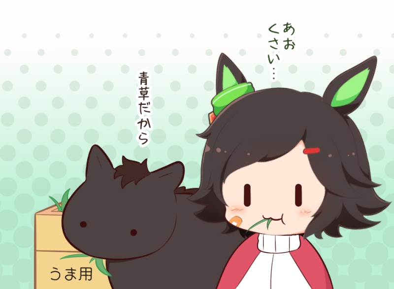 1girl :t animal bandaid bandaid_on_cheek bandaid_on_face black_hair blush_stickers box chibi closed_mouth eating gomashio_(goma_feet) gradient_background grass green_background hair_ornament hairclip halftone halftone_background horse jacket red_jacket swept_bangs track_jacket translation_request umamusume upper_body wavy_mouth white_background winning_ticket_(racehorse) winning_ticket_(umamusume) |_|