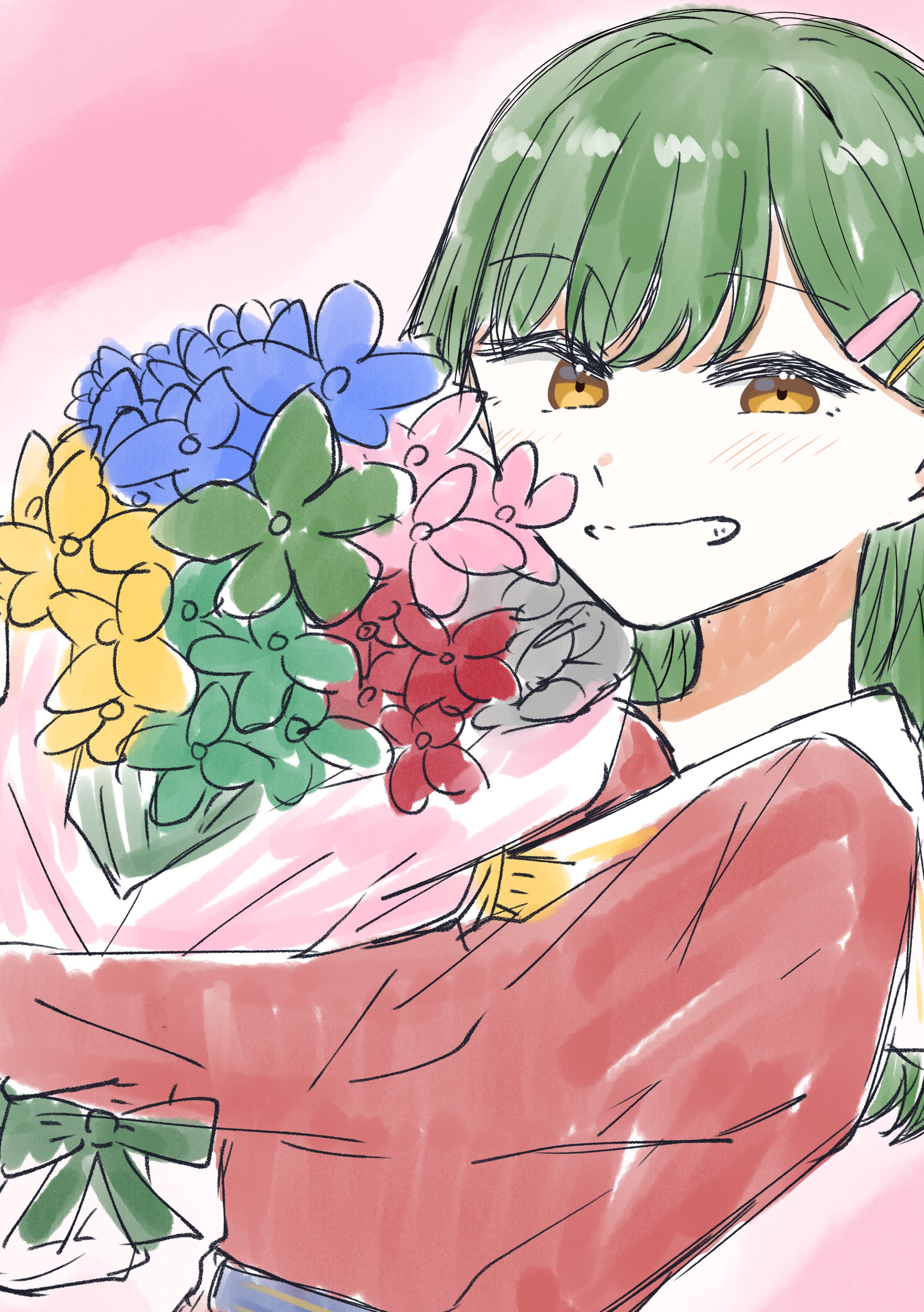 1girl absurdres blue_flower blush bouquet brown_dress dress flower from_side green_flower green_hair grey_flower grin hair_ornament hairclip hasu_no_sora_school_uniform highres holding holding_bouquet link!_like!_love_live! long_hair long_sleeves looking_at_viewer looking_to_the_side love_live! neckerchief ogami_sachi pale_color pink_background pink_flower puripuri_hurai red_flower sailor_collar sailor_dress school_uniform smile solo swept_bangs upper_body white_sailor_collar winter_uniform yellow_flower yellow_neckerchief