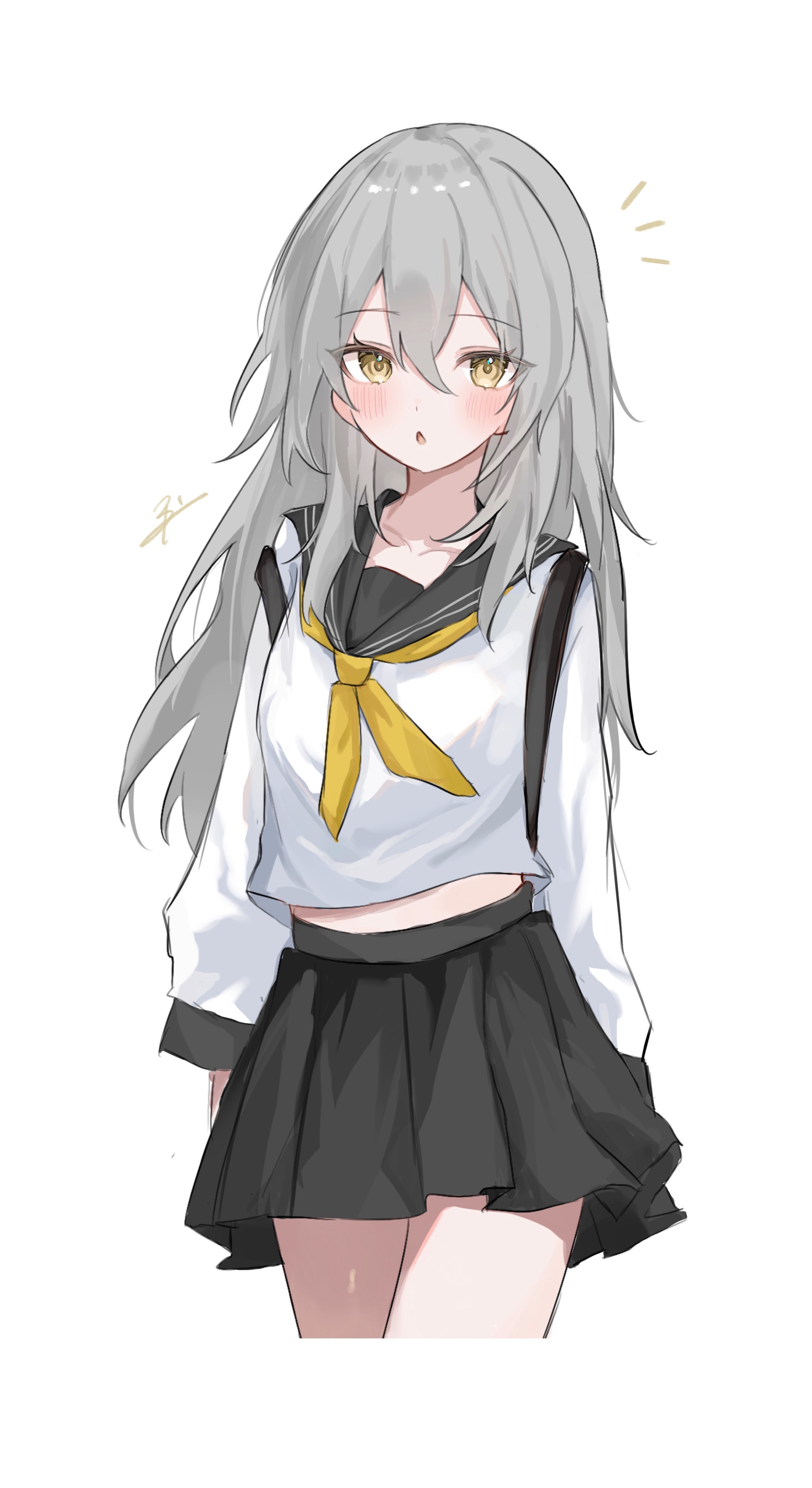 1girl :o absurdres arms_at_sides black_sailor_collar black_skirt cropped_legs dot_nose grey_hair highres honkai:_star_rail honkai_(series) karua0621 legs_together long_hair long_sleeves miniskirt neckerchief notice_lines open_mouth pleated_skirt sailor_collar school_uniform serafuku shirt shirt_overhang sidelocks signature skirt sleeve_cuffs solo stelle_(honkai:_star_rail) thighs trailblazer_(honkai:_star_rail) white_shirt yellow_eyes yellow_neckerchief