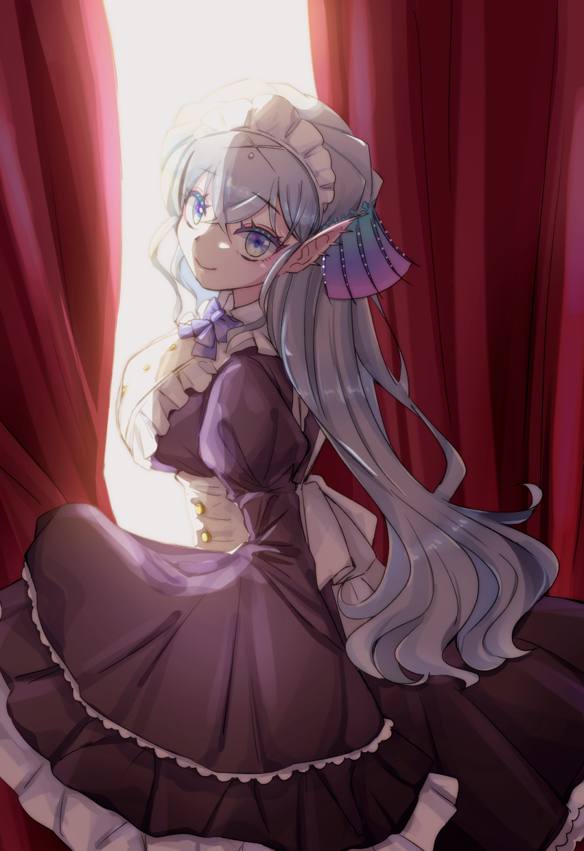 1girl alternate_costume apron black_dress blue_eyes breasts dress duel_monster enmaided fins frilled_apron frills grey_hair hayupipipipi head_fins highres kitkallos_(yu-gi-oh!) large_breasts long_hair long_sleeves looking_at_viewer maid maid_apron maid_headdress puffy_sleeves sleeves_past_wrists smile solo tearlaments_kitkallos white_apron yu-gi-oh!