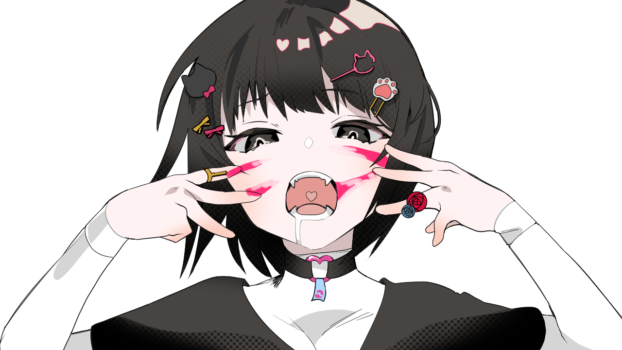 1other animal_(vocaloid) black_choker black_eyes black_hair black_shirt cat_hair_ornament catt_(project_moon) choker drawn_whiskers fangs hair_ornament hair_ribbon heart heart_o-ring heart_ring_choker layered_sleeves long_sleeves madotsuki_ren o-ring o-ring_choker open_mouth paw_hair_ornament pink_ribbon project_moon ribbon shirt short_hair short_over_long_sleeves short_sleeves solo transparent_background wonderlab yellow_ribbon