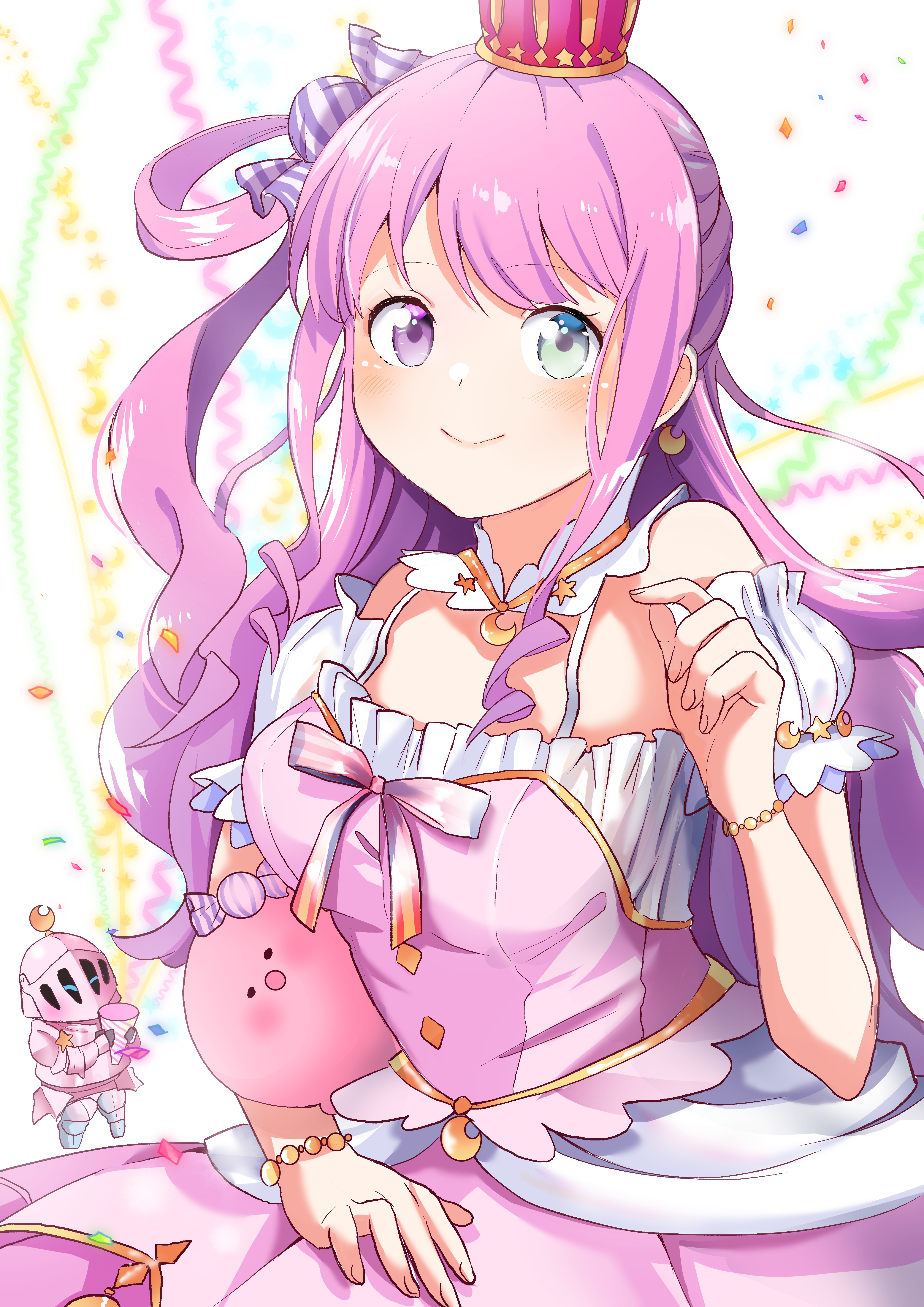 1girl absurdres candy_hair_ornament collar crescent crescent_earrings crown detached_collar dress earrings food-themed_hair_ornament green_eyes hair_ornament heterochromia highres himemori_luna himemori_luna_(1st_costume) hololive jewelry long_hair looking_at_viewer luknight_(himemori_luna) mini_crown pink_dress pink_hair purple_eyes rabusenn red_crown single_earring sleeveless sleeveless_dress smile solo virtual_youtuber white_collar