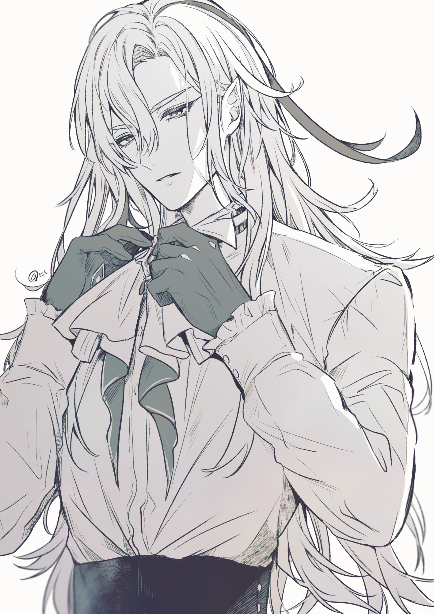 1boy adjusting_clothes adjusting_tie formal_clothes genshin_impact gloves greyscale highres long_hair looking_at_viewer monochrome neuvillette_(genshin_impact) pointy_ears solo tanuki_nishi twitter white_background