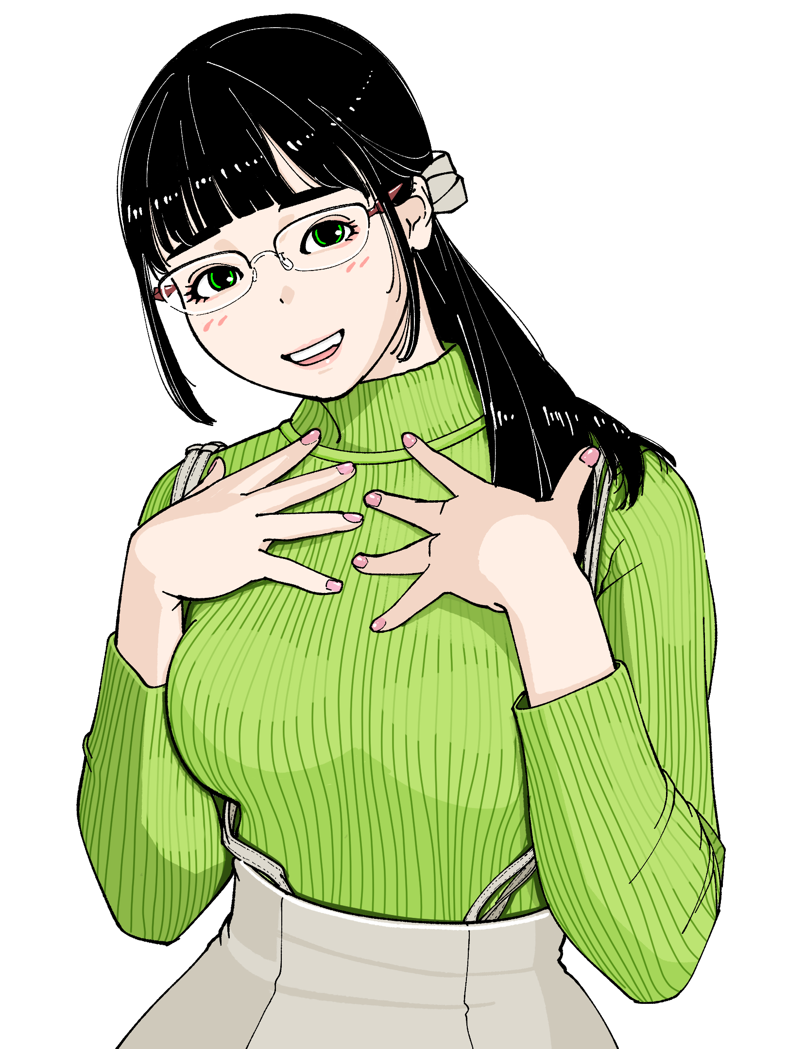 1girl animification black_hair blush breasts glasses green_eyes green_sweater grey_skirt head_tilt highres long_hair medium_breasts open_mouth pink_nails real_life ribbed_sweater sakamoto_giulietta shinonome_umi simple_background skirt smile solo suspenders sweater sweater_tucked_in teeth upper_teeth_only white_background