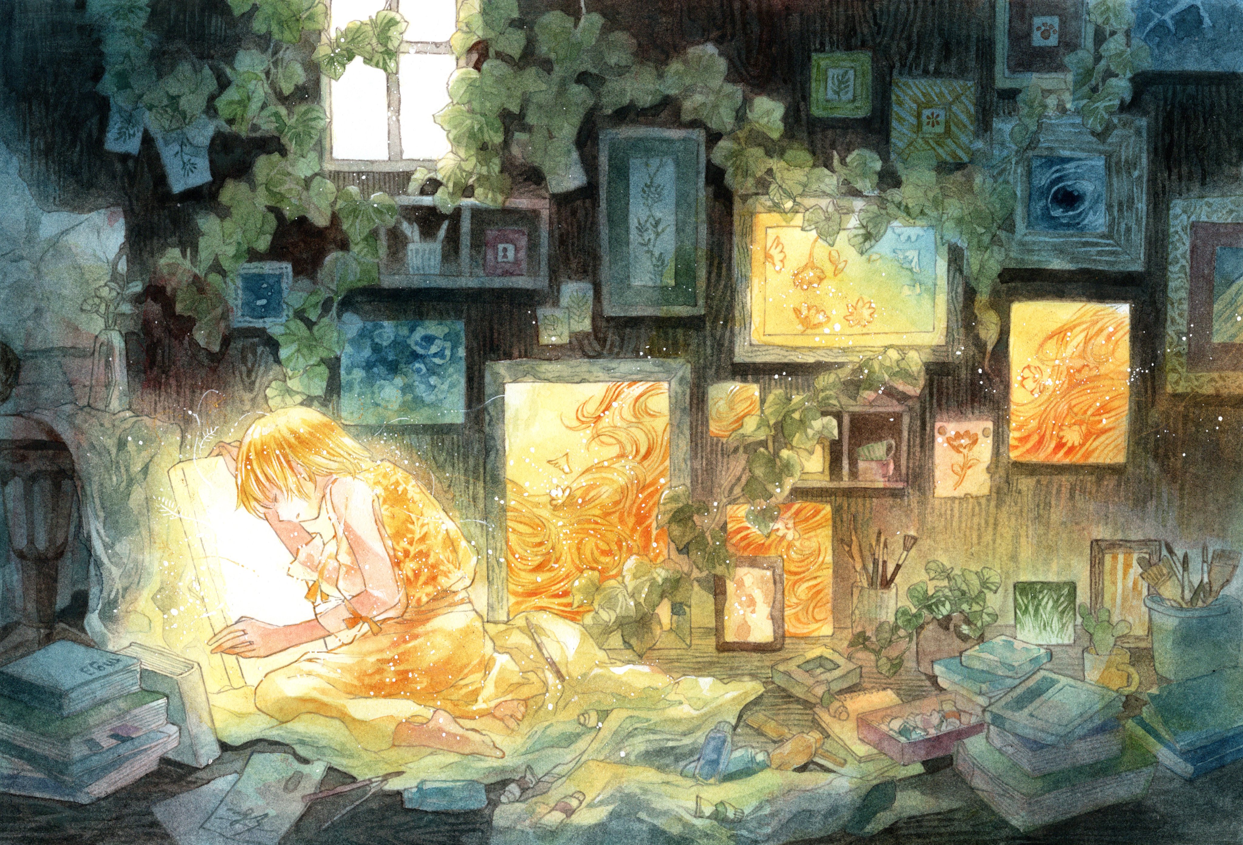 1girl absurdres blonde_hair book canvas_(object) closed_eyes full_body highres ivy leaf long_hair megumi_(mg3) original paint painting_(object) paper picture_frame sitting solo window