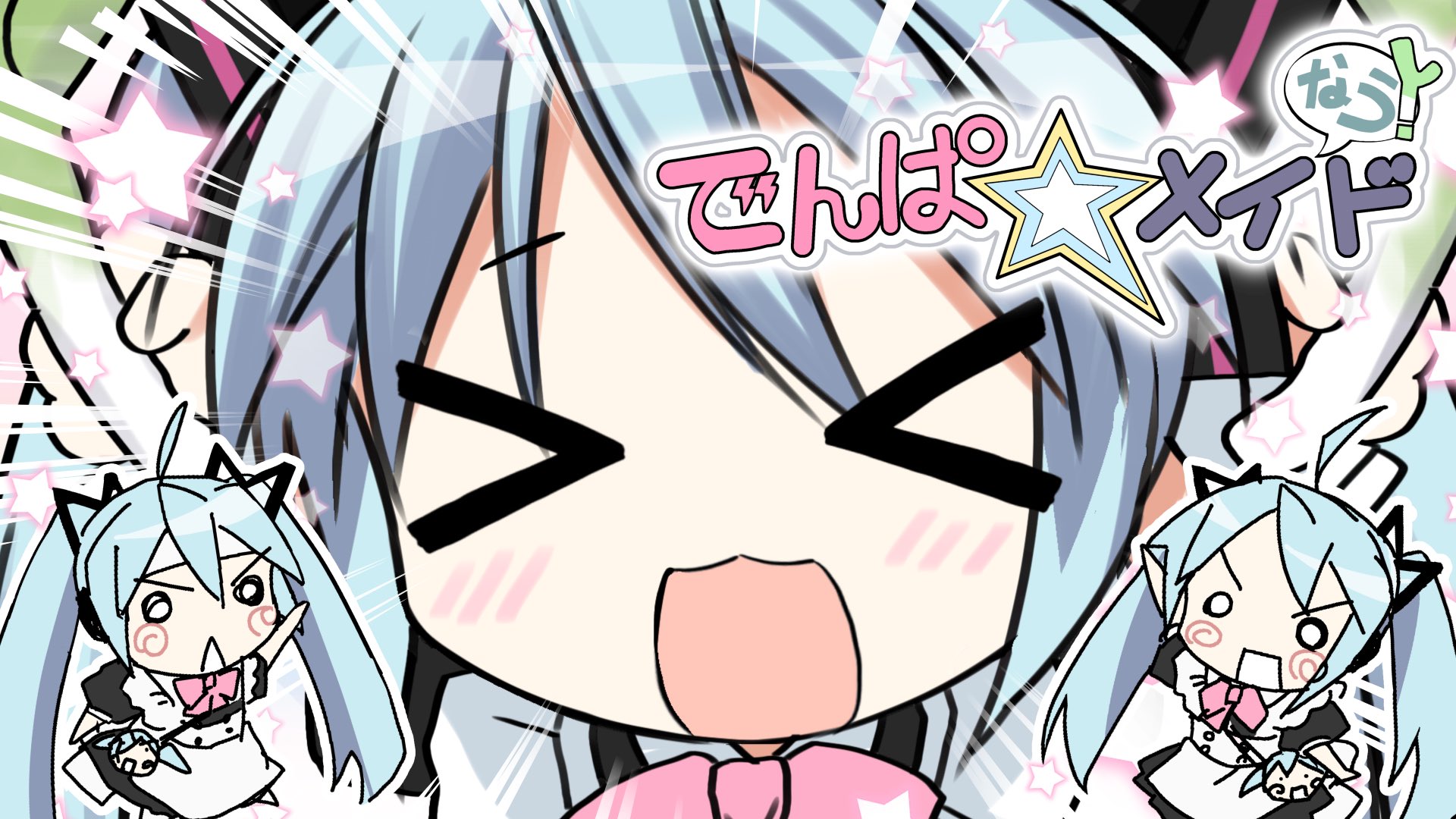 >_< 2000s_(style) 3girls :3 alternate_costume apron arm_up bag black_dress blue_hair blush bow bowtie character_bag chibi chibi_inset clone denpa_meido_nau_(vocaloid) dress dual_wielding emphasis_lines facing_viewer food hachune_miku hair_ornament hands_up hatsune_miku highres holding holding_food holding_spring_onion holding_vegetable long_hair looking_at_viewer maid maid_apron multiple_girls o_o open_mouth outline pink_bow pink_bowtie portrait puffy_short_sleeves puffy_sleeves ryuudouji_(p0myu) short_sleeves shoulder_bag smile song_name spring_onion twintails v-shaped_eyebrows vegetable vocaloid white_outline