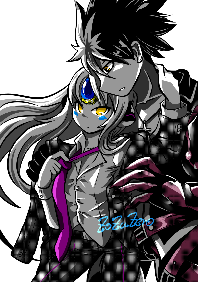 1boy 1girl black_hair code:_nemesis_(elsword) couple cross cross_necklace elsword eve_(elsword) expressionless face-to-face facial_mark forehead_jewel formal_clothes grey_hair hug jacket jewelry long_hair mechanical_arms mechanical_ears multicolored_hair necklace necktie raven_cronwell reckless_fist_(elsword) robot_ears shirt signature single_mechanical_arm spiked_hair two-tone_hair white_background white_hair yellow_eyes zoza