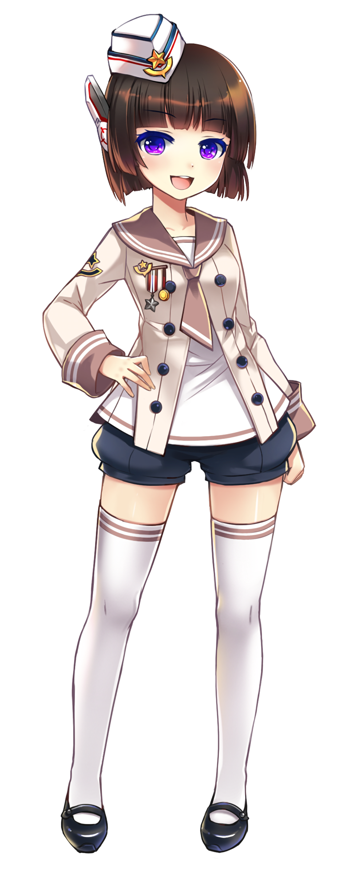 1girl absurdres black_hair black_shoes black_shorts blunt_bangs bob_cut breasts brown_necktie brown_sailor_collar buttons clenched_hand colored_eyelashes dot_nose double-breasted full_body hair_ornament hand_on_own_hip hat highres long_sleeves looking_at_viewer mary_janes master_of_eternity medal military_hat military_uniform mini_hat necktie official_art open_mouth purple_eyes sailor_collar shirt shoes short_hair short_shorts shorts small_breasts smile socks solo star_(symbol) tachi-e teeth thighhighs third-party_source tilted_headwear transparent_background upper_teeth_only white_hat white_shirt white_socks white_thighhighs yulia_(master_of_eternity) zettai_ryouiki