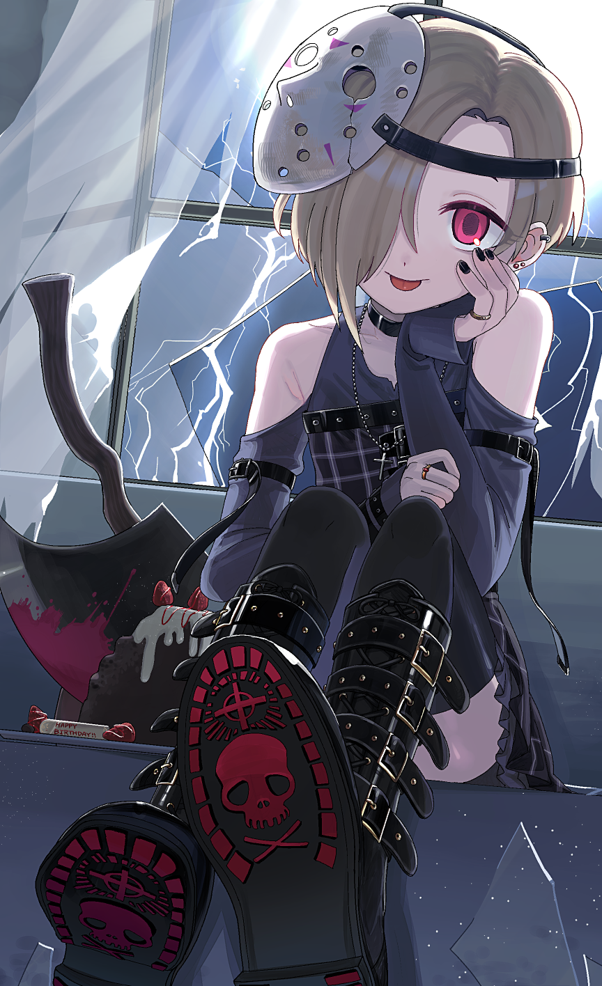 1girl :p axe bare_shoulders belt_boots black_choker black_nails black_skirt black_thighhighs blonde_hair blood blood_on_axe boots broken_window cake choker clothing_cutout cross cross_necklace curtains flat_chest food full_moon hair_over_one_eye happy_birthday highres hockey_mask idolmaster idolmaster_cinderella_girls jewelry long_sleeves looking_at_viewer lvetica mask mask_on_head moon necklace night pink_eyes ring shirasaka_koume shirt shoe_soles short_hair shoulder_cutout sitting skirt skull_print sleeves_past_wrists smile solo thighhighs tongue tongue_out window