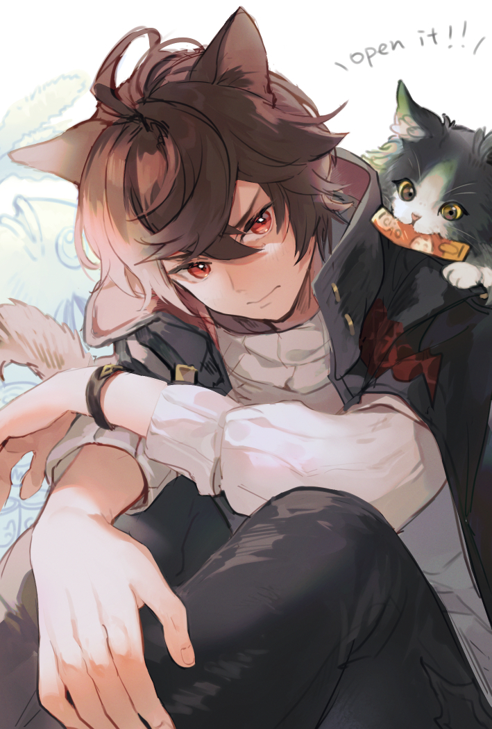 1boy 1other :3 a4_paper ahoge animal animal_ears animal_on_shoulder black_pants bracelet brown_hair cat cat_ears cat_on_shoulder cat_tail commentary commentary_request cropped_legs english_text ewiyar_(granblue_fantasy) food_in_mouth frown furrowed_brow granblue_fantasy hair_between_eyes hand_on_own_leg jacket jacket_on_shoulders jewelry kemonomimi_mode knees_up looking_at_viewer messy_hair mixed-language_commentary pants sandalphon_(granblue_fantasy) sandalphon_(valentine)_(granblue_fantasy) short_hair sitting sweater sweater_vest tail turtleneck turtleneck_sweater white_sweater_vest