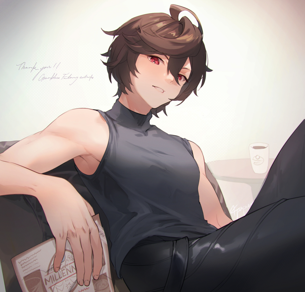 1boy a4_paper ahoge armpit_crease brown_hair coffee coffee_mug commentary commentary_request couch cowboy_shot cropped_legs cup disposable_coffee_cup disposable_cup english_commentary english_text fingernails granblue_fantasy hair_between_eyes holding holding_menu leather leather_pants looking_at_viewer male_focus menu messy_hair mixed-language_commentary mug on_couch pants red_eyes sandalphon_(granblue_fantasy) short_hair sleeveless sleeveless_turtleneck smile solo_focus turtleneck