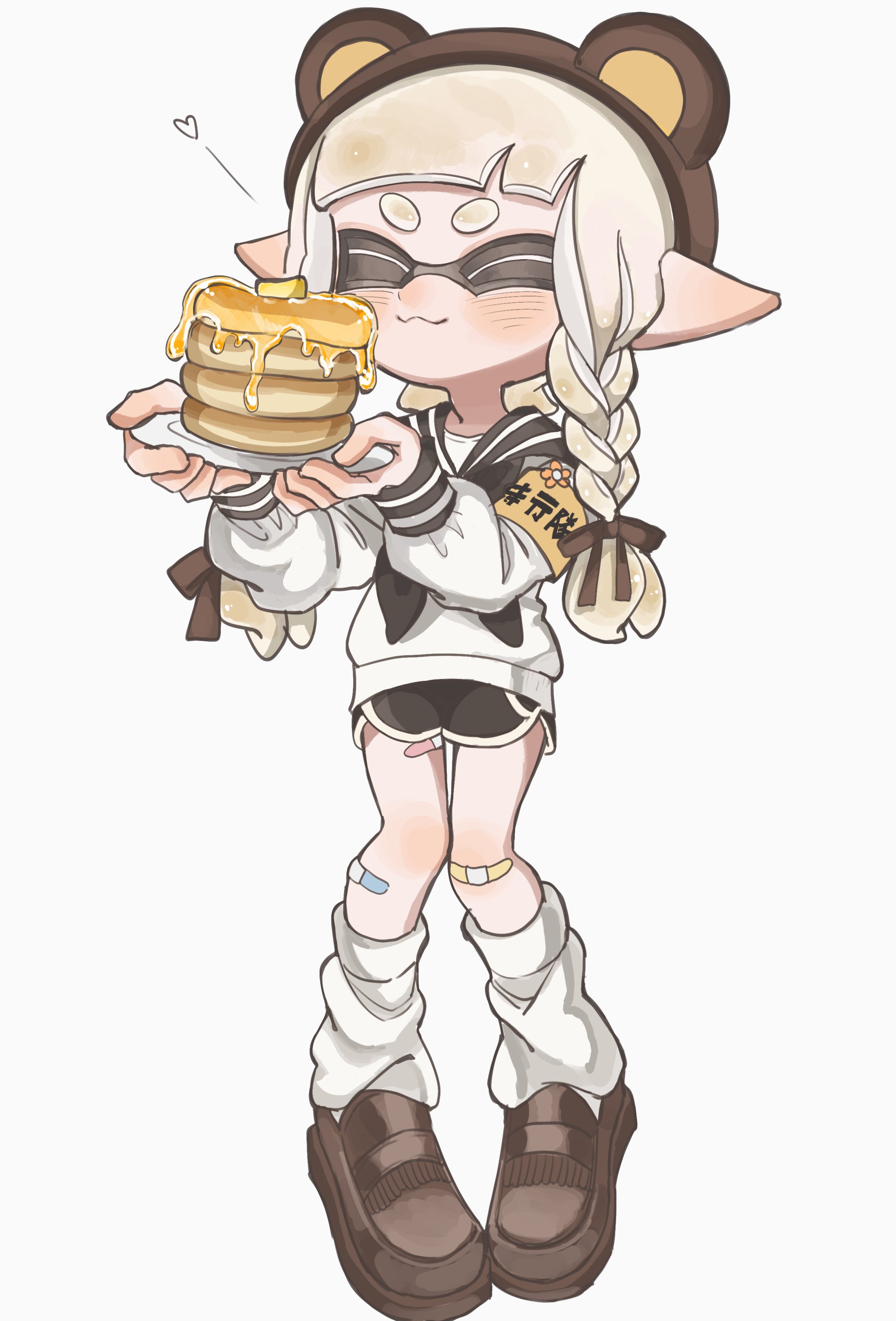 1girl :3 absurdres animal_ear_hairband animal_ears bandaid bandaid_on_leg bear_ears black_shorts brown_hairband brown_shoes butter closed_eyes closed_mouth commentary dolphin_shorts fake_animal_ears food full_body hairband heart highres holding holding_plate inkling inkling_girl inkling_player_character leg_warmers lemo_(lemo_4) light_blush long_hair maple_syrup nintendo pancake pancake_stack plate pointy_ears sailor_collar sailor_shirt shirt shoes shorts smile solo splatoon_(series) standing untranslatable_commentary tentacle_hair thick_eyebrows white_trim