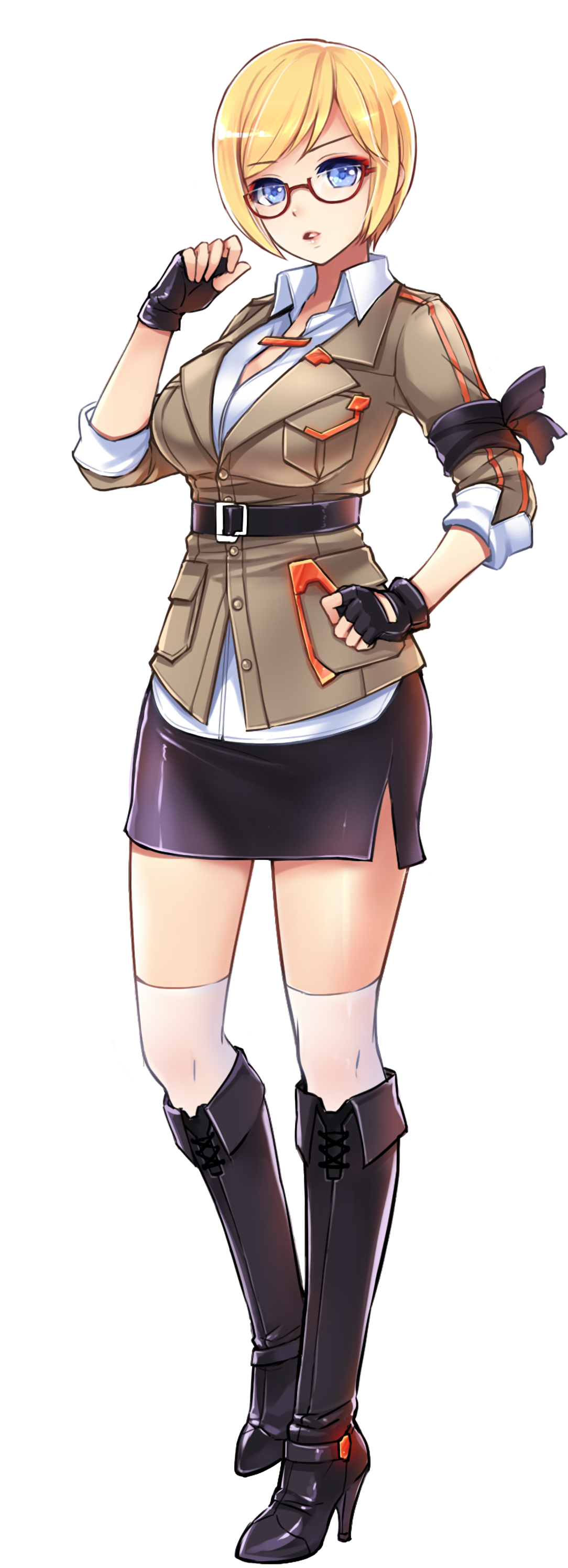 1girl absurdres anna_(master_of_eternity) armband black_armband black_boots black_gloves black_skirt blonde_hair blue_eyes bob_cut boots breast_pocket breasts brown_jacket buttons fingerless_gloves full_body glasses gloves hand_on_own_hip hand_up high_heels highres jacket large_breasts lips looking_at_viewer master_of_eternity military_uniform miniskirt official_art parted_lips partially_unbuttoned pocket red-framed_eyewear semi-rimless_eyewear shirt short_hair side_slit skirt socks solo swept_bangs tachi-e thighhighs third-party_source transparent_background white_shirt white_socks white_thighhighs zettai_ryouiki