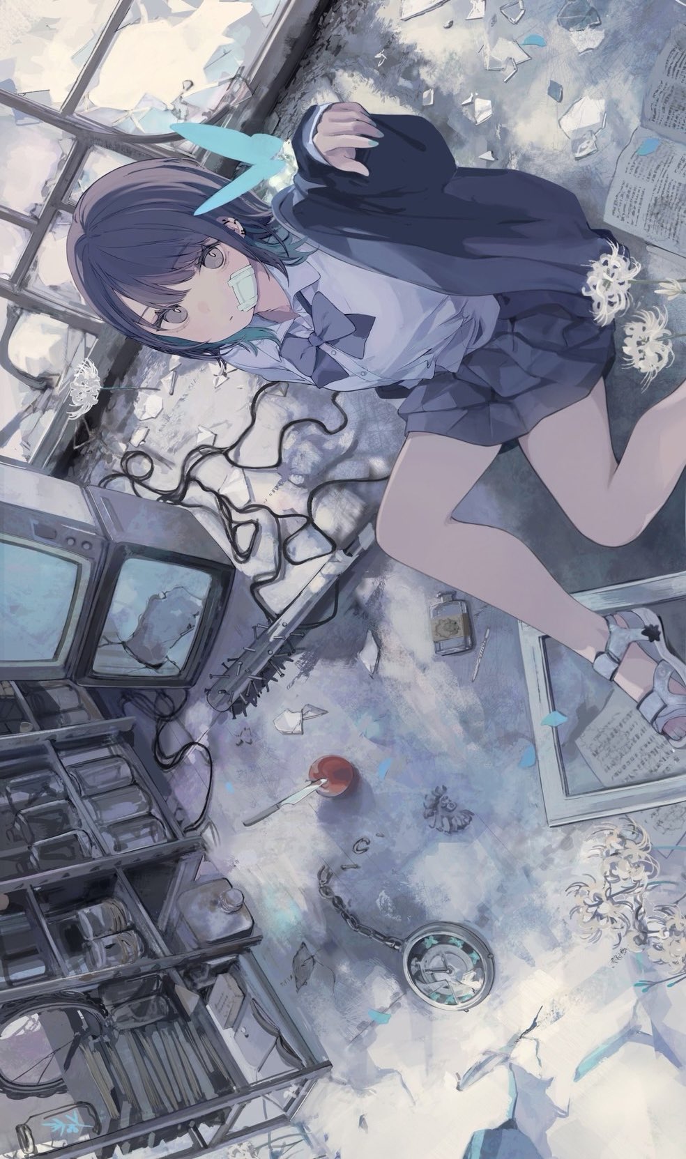 1girl apple bandaid bandaid_on_face black_hair black_jacket blue_butterfly book bow bowtie broken_glass broken_window bug butterfly clock collared_shirt crt exif_rotation flower food fruit glass glass_shards grey_eyes hand_up highres indoors insect jacket jar long_sleeves looking_at_viewer multicolored_hair on_floor open_clothes open_jacket original paper picture_frame pleated_skirt sandals school_uniform shirt short_hair sitting skirt solo television tokiwata_soul watch white_sandals white_shirt window