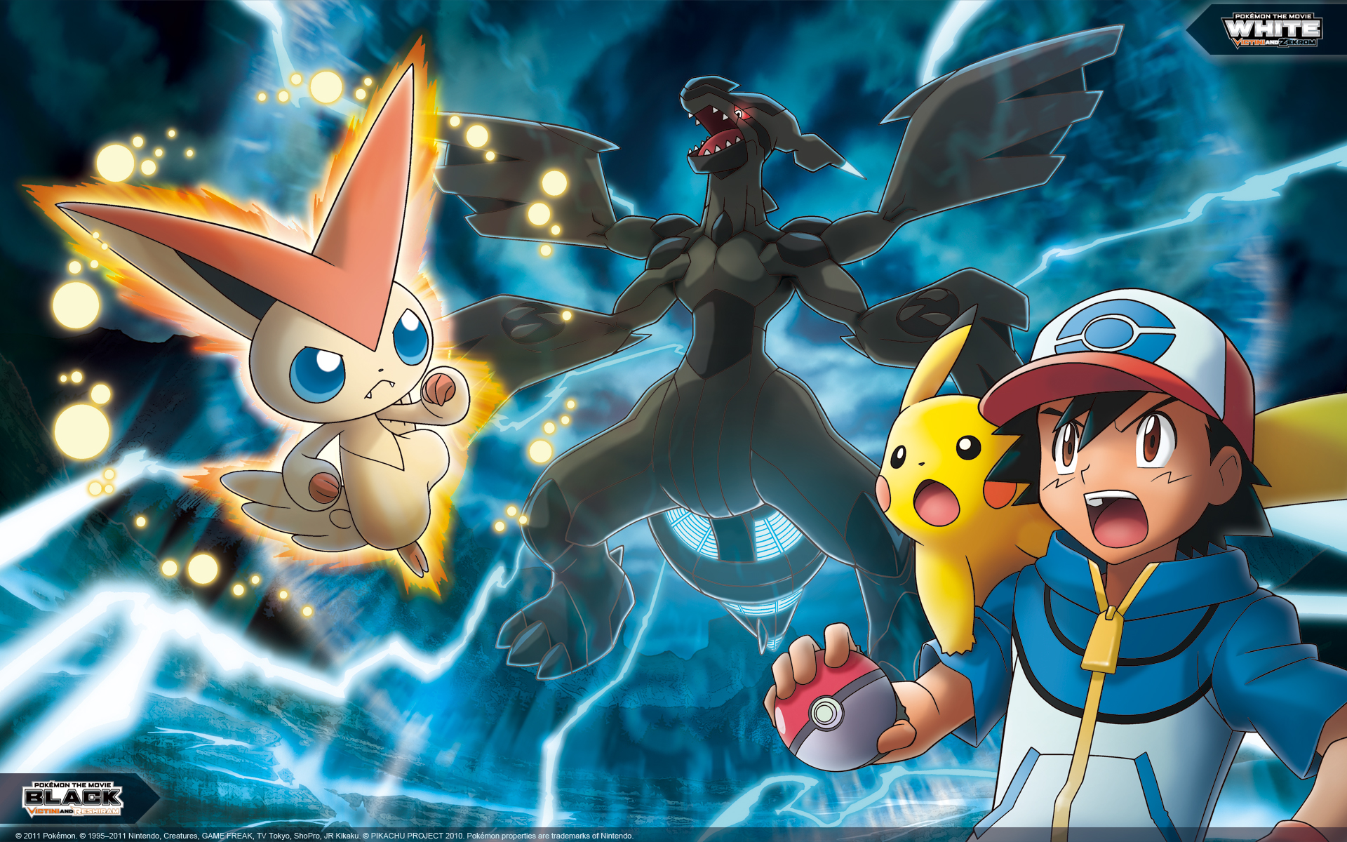 ash_ketchum castle copyright_logo dragon electricity fangs flying gen_1_pokemon gen_5_pokemon glowing glowing_eyes highres legendary_pokemon logo multiple_boys mythical_pokemon nintendo official_art pikachu pokemon pokemon_(anime) pokemon_(creature) pokemon_the_series:_black_&_white pokemon_the_movie:_black/white_-_victini_and_reshiram/zekrom red_eyes smile tail teamwork victini zekrom zekrom_(overdrive)