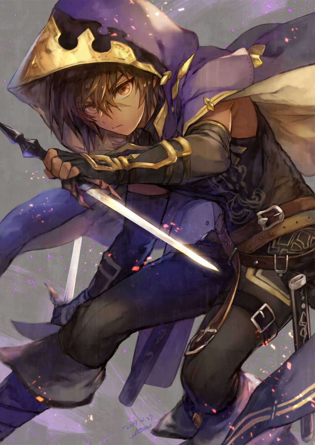 1boy belt black_gloves black_hair boots cloak commentary_request dark-skinned_male dark_skin dated elbow_gloves fighting_stance gloves granblue_fantasy highres holding holding_knife hood hooded_cloak jamil_(granblue_fantasy) knee_boots knife looking_at_viewer male_focus multiple_belts purple_cloak scar scar_on_face serious short_hair shuu_(fuhm7757) signature sleeveless solo sparks standing toned toned_male yellow_eyes