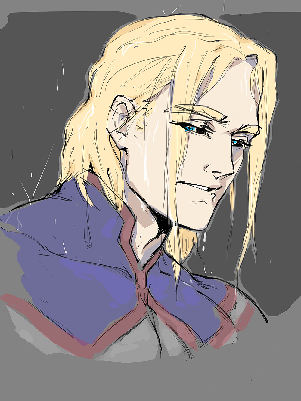 1boy black_sclera blonde_hair blue_bodysuit blue_eyes bodysuit boku_no_hero_academia collarbone colored_sclera cropped_shoulders freesilverwind grey_background highres long_hair looking_at_viewer male_focus parted_lips pectorals rain short_hair solo wet wet_hair yagi_toshinori
