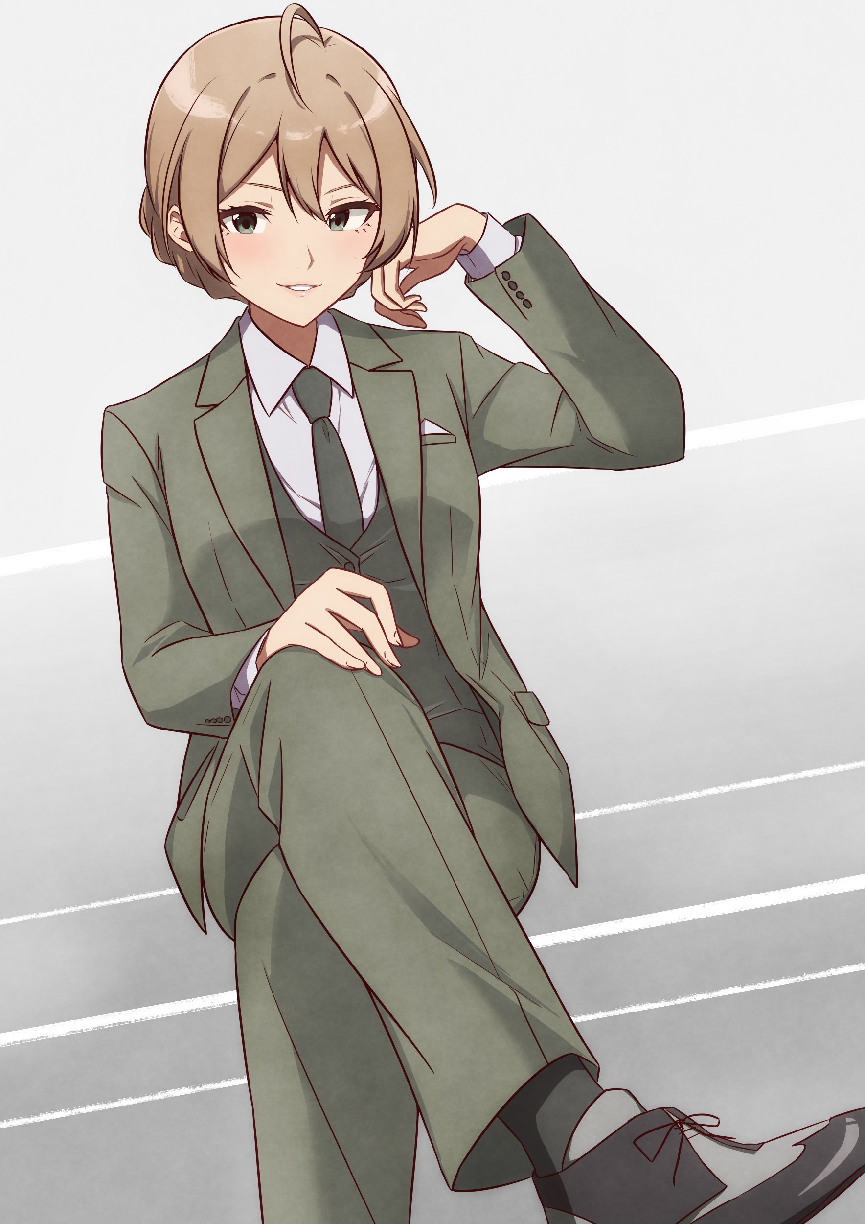 1girl absurdres ahoge black_shoes blush braid breasts brown_hair crossdressing crossdressing_(ftm) crossed_legs formal_clothes green_eyes green_necktie green_pants green_suit green_vest grey_background grey_socks hair_between_eyes hand_on_own_cheek hand_on_own_face hand_on_own_knee hand_up head_rest highres idolmaster idolmaster_million_live! idolmaster_million_live!_theater_days jacket large_breasts long_sleeves looking_at_viewer necktie nusisippi open_clothes open_jacket pants parted_lips sakuramori_kaori shirt shoes short_hair sitting smile socks solo suit vest white_shirt