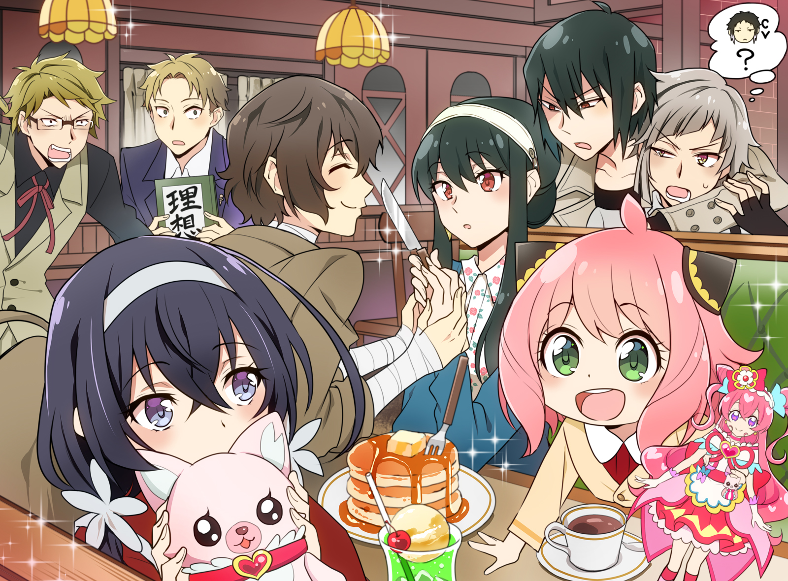 3girls 6+boys :o akutagawa_ryuunosuke_(bungou_stray_dogs) anya_(spy_x_family) bandaged_arm bandages black_hair book brown_hair bungou_stray_dogs closed_eyes cone_hair_bun crossover cup dazai_osamu_(bungou_stray_dogs) food fork green_eyes grey_hair hair_bun hairband highres indoors izumi_kyouka_(bungou_stray_dogs) kitchen_knife knife kunikida_doppo_(bungou_stray_dogs) lamp lapels long_sleeves masako_(sabotage-mode) multiple_boys multiple_crossover multiple_girls nakajima_atsushi_(bungou_stray_dogs) open_mouth pancake pink_hair red_eyes short_hair smile speech_bubble spy_x_family twilight_(spy_x_family) vest voice_actor_connection yor_briar yuri_briar