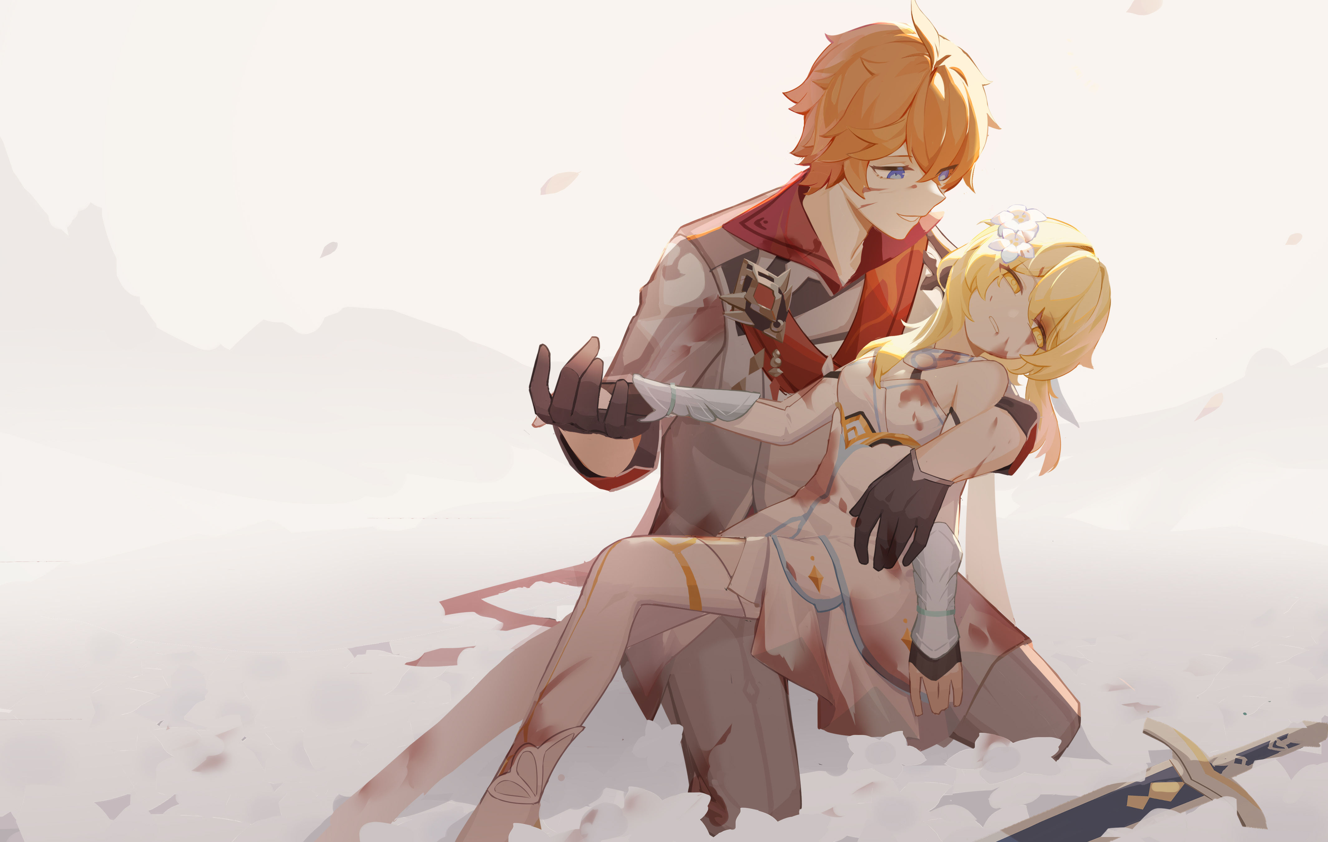 1boy 1girl absurdres black_gloves blonde_hair blood blood_on_clothes blood_on_face blue_eyes couple cowboy_shot dress flower full_body genshin_impact gloves hair_flower hair_ornament hetero highres holding_another's_wrist lumine_(genshin_impact) orange_hair short_hair sitting solo sword tartaglia_(genshin_impact) weapon white_dress worlin4