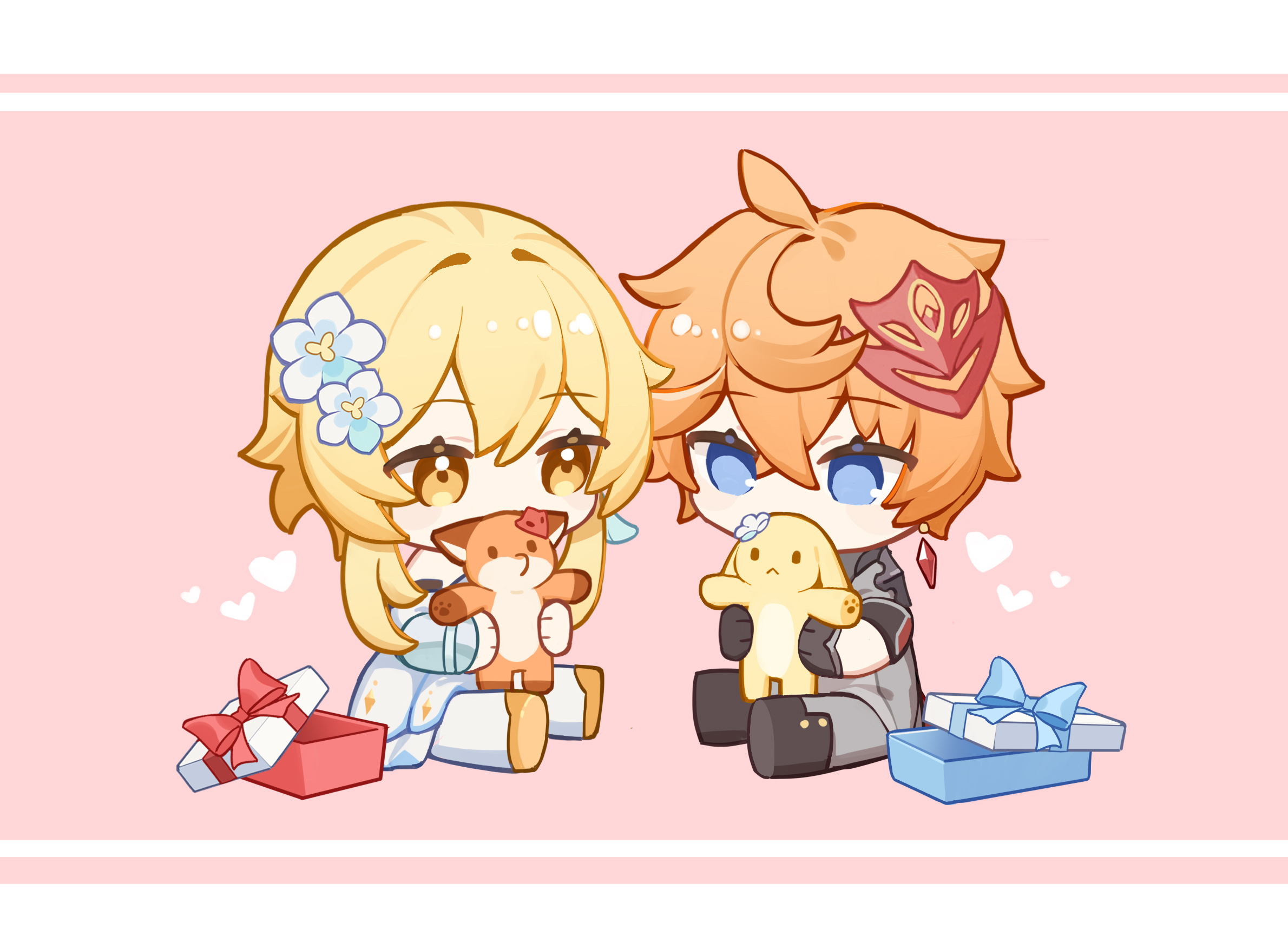 1boy 1girl blonde_hair blue_eyes box character_doll chibi couple doll flower full_body genshin_impact gift gift_box hair_flower hair_ornament heart hetero highres lumine_(genshin_impact) mask mask_on_head orange_hair short_hair sitting tartaglia_(genshin_impact) worlin4 yellow_eyes