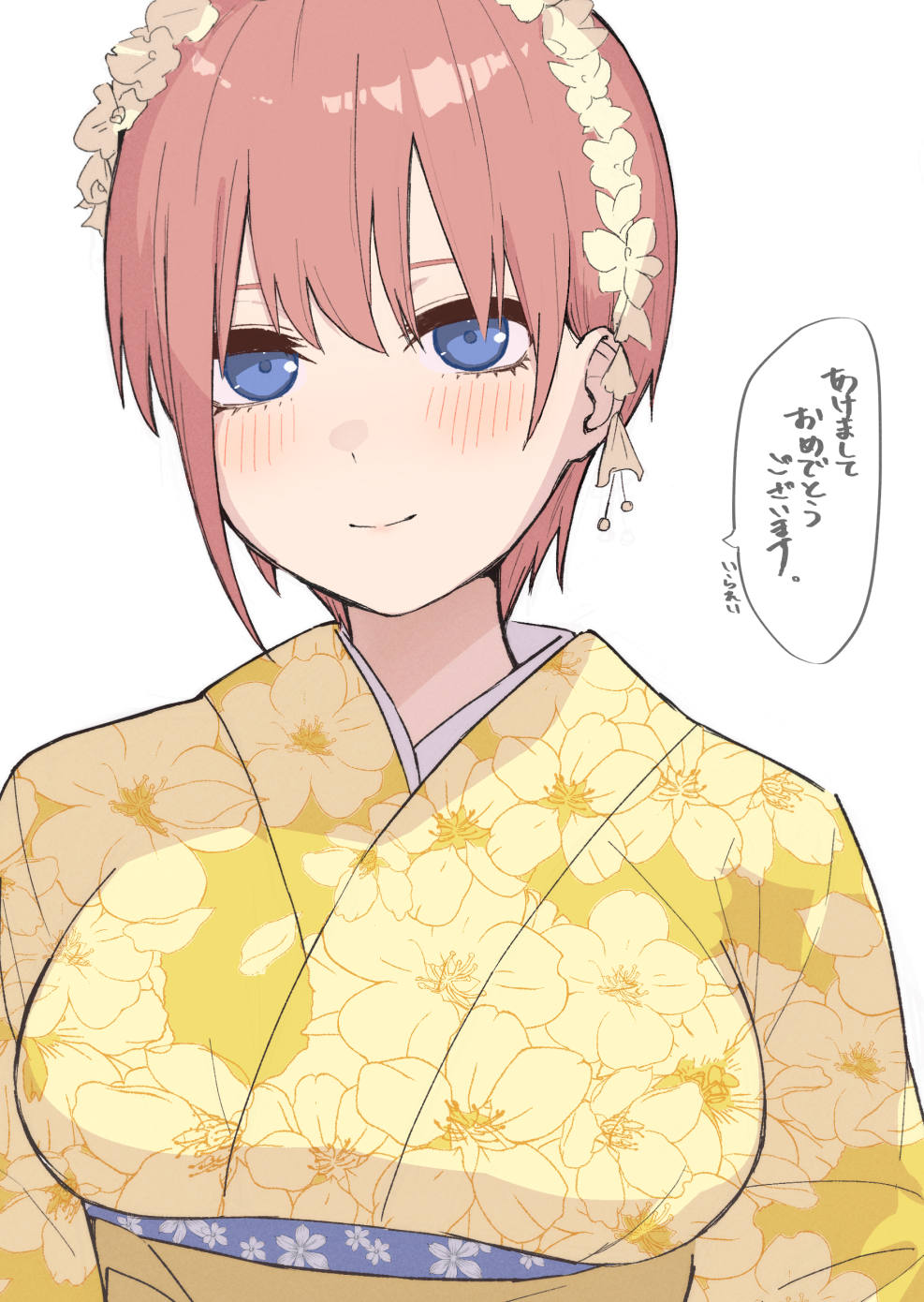 1girl blue_eyes blush breasts flower go-toubun_no_hanayome hair_flower hair_ornament headband highres irarei_(araisanblog) japanese_clothes kimono large_breasts light_smile looking_at_viewer nakano_ichika obi pink_hair sash simple_background solo speech_bubble upper_body white_background yellow_kimono yukata