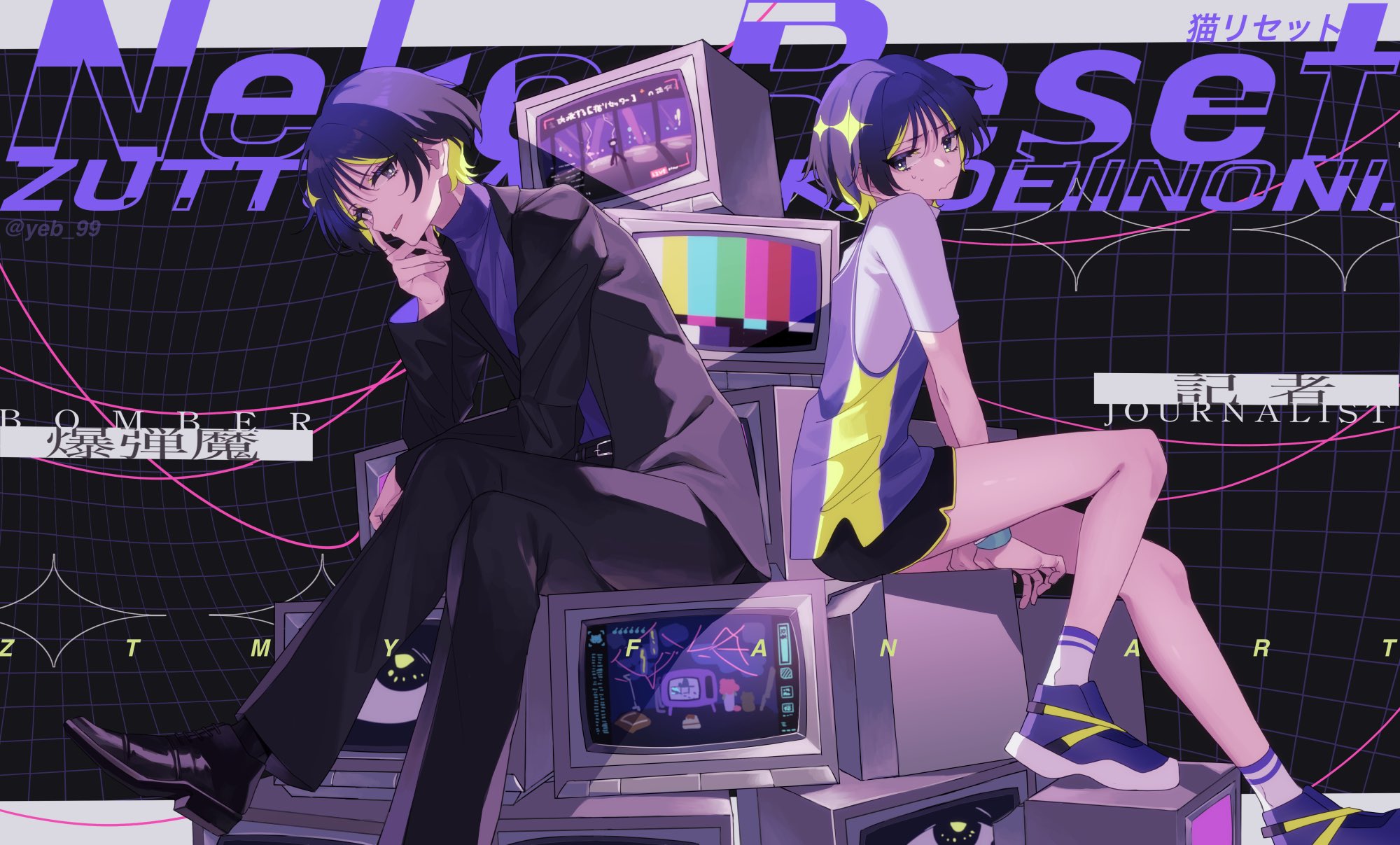 black_footwear blue_footwear blue_hair colored_inner_hair english_text highres kaiya multicolored_hair nira-chan shorts television two-tone_hair zutto_mayonaka_de_ii_no_ni