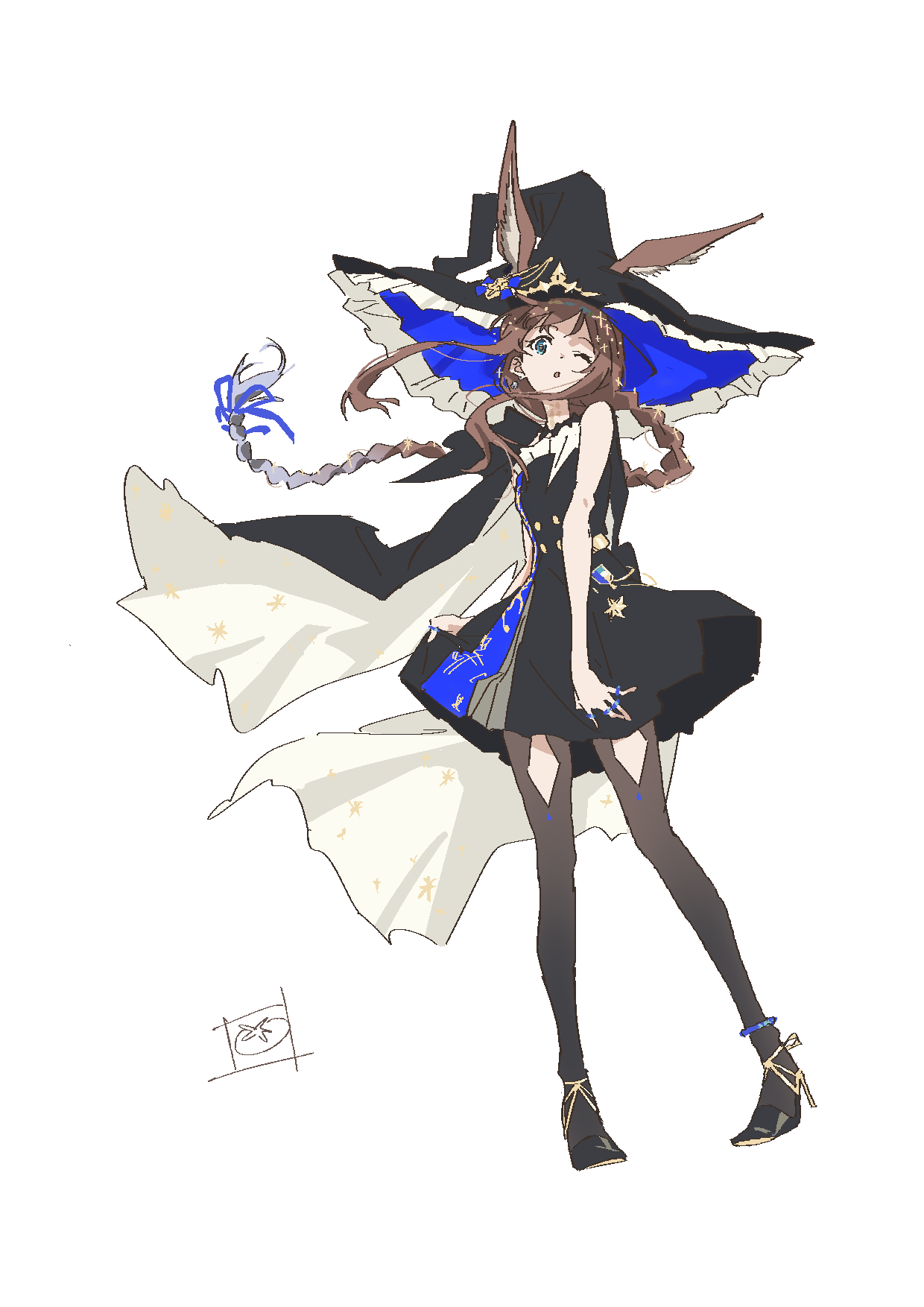 1girl amiya_(arknights) amiya_(medic)_(arknights) amiya_(medic)_(solo_around_the_world)_(arknights) animal_ears arknights black_dress blue_eyes braid brown_hair dress full_body hair_ornament hat highres jewelry long_hair ring sleeveless sleeveless_dress solo tomato_(lsj44867) witch_hat