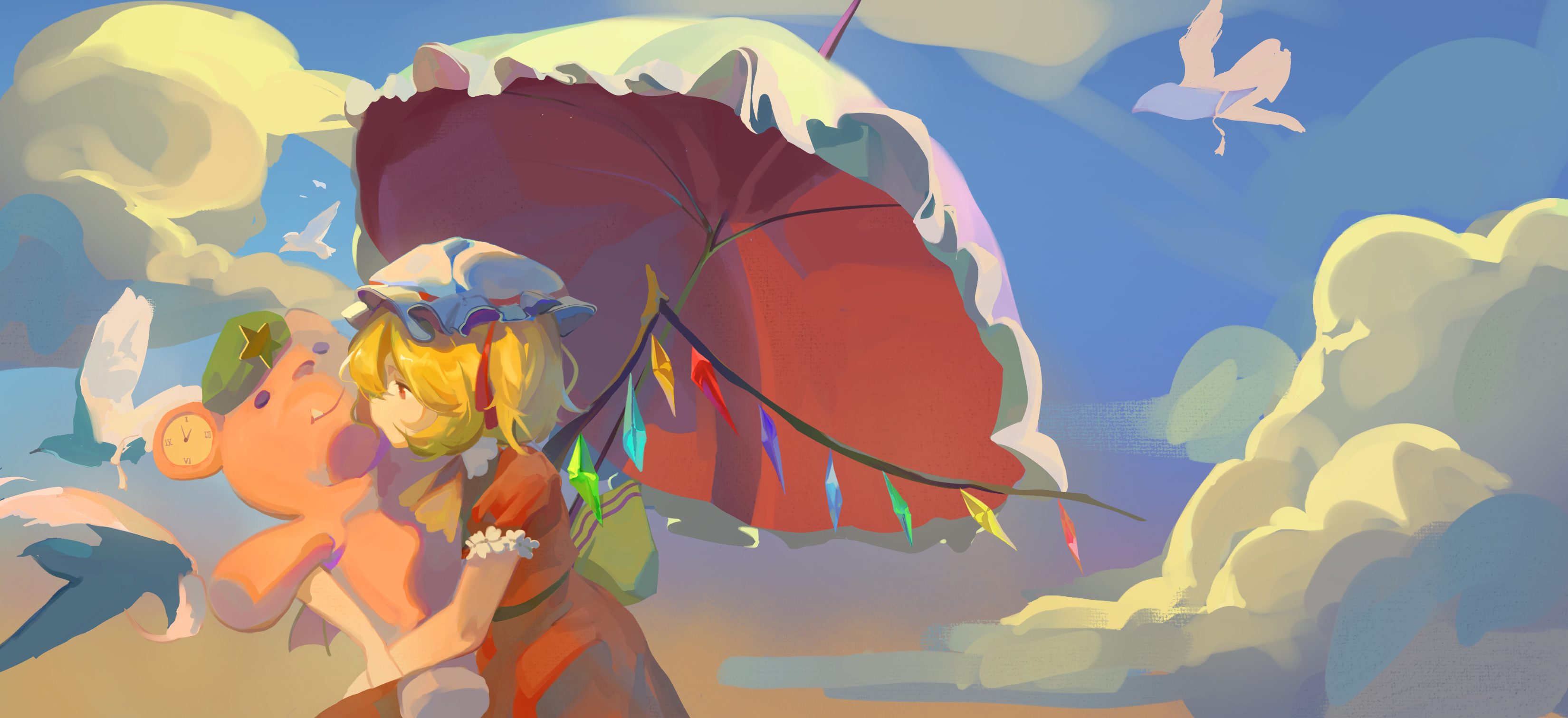1girl absurdres aleng ascot bird blonde_hair blue_sky cloud cowboy_shot crystal_wings dove flandre_scarlet from_side hat highres mob_cap outdoors parasol peaked_cap red_ribbon ribbon sky solo stuffed_animal stuffed_toy teddy_bear touhou umbrella wings yellow_ascot