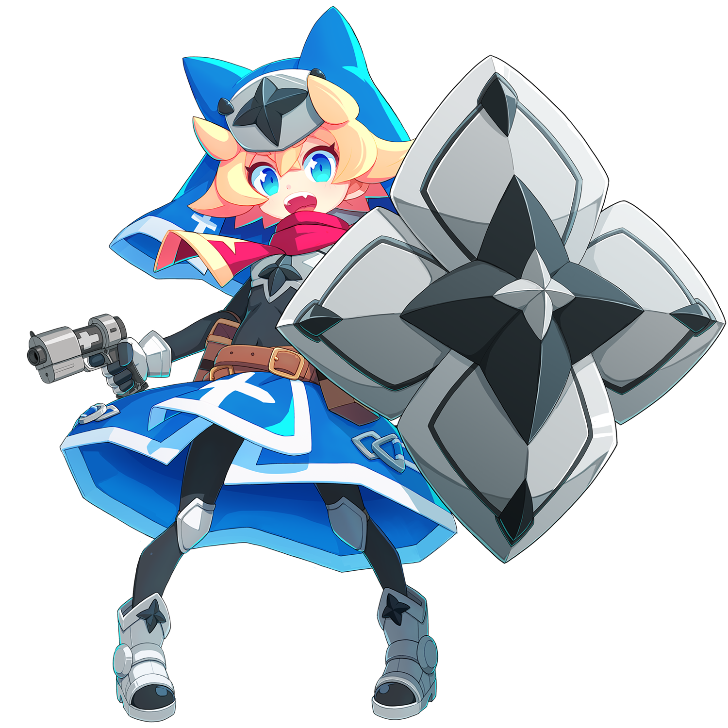 1girl armor blonde_hair blue_eyes blush fang full_body gun highres holding holding_gun holding_shield holding_weapon looking_at_viewer open_mouth original ranka_(tonbo) shield smile solo teeth transparent_background upper_teeth_only weapon