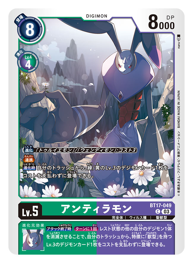 andiramon animal_ears artist_name brown_fur card_(medium) character_name commentary_request copyright_name daisy_(flower) digimon digimon_(creature) digimon_card_game feet_out_of_frame flower horns mountain naru_(kts5584) nature official_art outdoors oversized_limbs rabbit rabbit_ears red_eyes translation_request