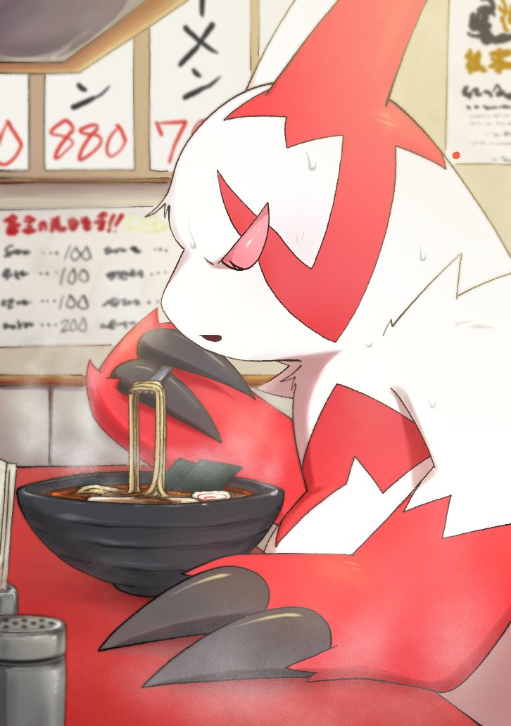 bowl chopsticks claws colored_sclera food from_side gen_3_pokemon holding holding_chopsticks indoors matchstick_39 nintendo no_humans noodles pokemon pokemon_(creature) ramen red_sclera solo sweat upper_body zangoose