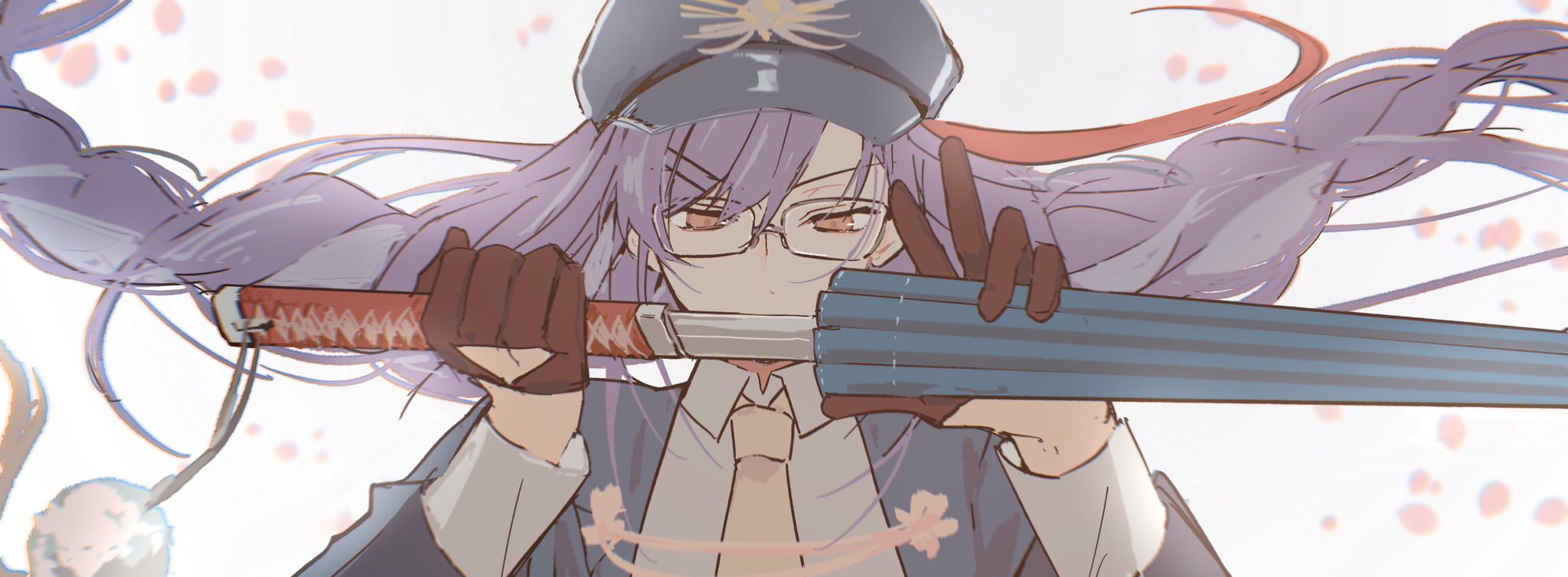 1girl akafuyu_(arknights) akafuyu_(temperament)_(arknights) arknights black_hat black_jacket blue_umbrella braid brown_eyes brown_gloves closed_umbrella collared_shirt commentary floating_hair glasses gloves grey_background hair_between_eyes hair_ornament hairclip half_gloves hands_up hat highres holding holding_sword holding_umbrella holding_weapon jacket long_hair long_sleeves looking_at_viewer low_twintails necktie one-hour_drawing_challenge open_clothes open_jacket peaked_cap purple_hair sheath shirt shouganaigame simple_background solo sword twin_braids twintails umbrella umbrella_sword unsheathing upper_body v-shaped_eyebrows weapon white_shirt yellow_necktie