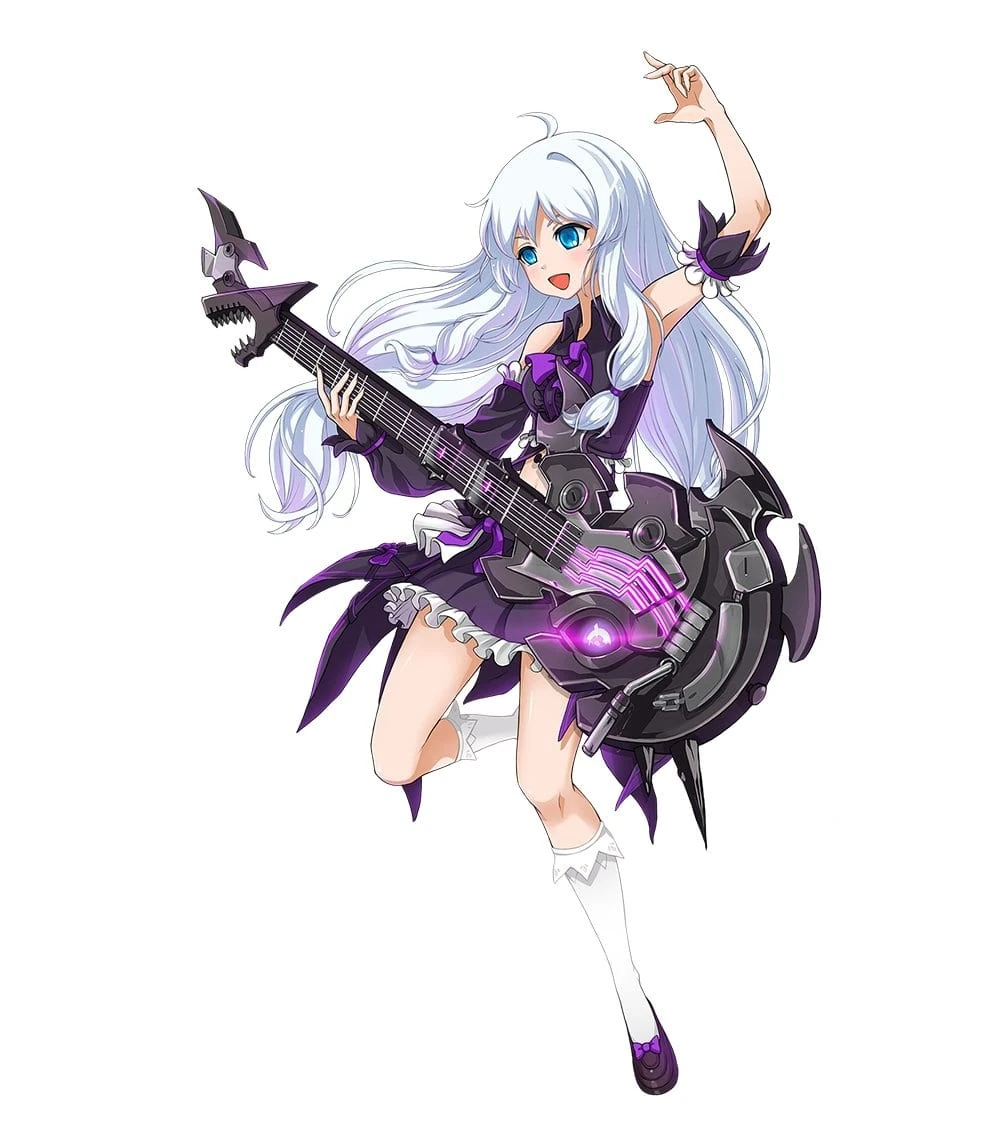 1girl ahoge asymmetrical_sleeves bare_shoulders blue_eyes bow bowtie detached_sleeves electric_guitar frilled_skirt frills guitar instrument kneehighs long_hair low-tied_long_hair miniskirt official_art open_mouth purple_bow purple_bowtie purple_shirt purple_skirt shirt simple_background skirt sleeveless sleeveless_shirt socks solo soulworker stella_unibell uneven_sleeves white_hair