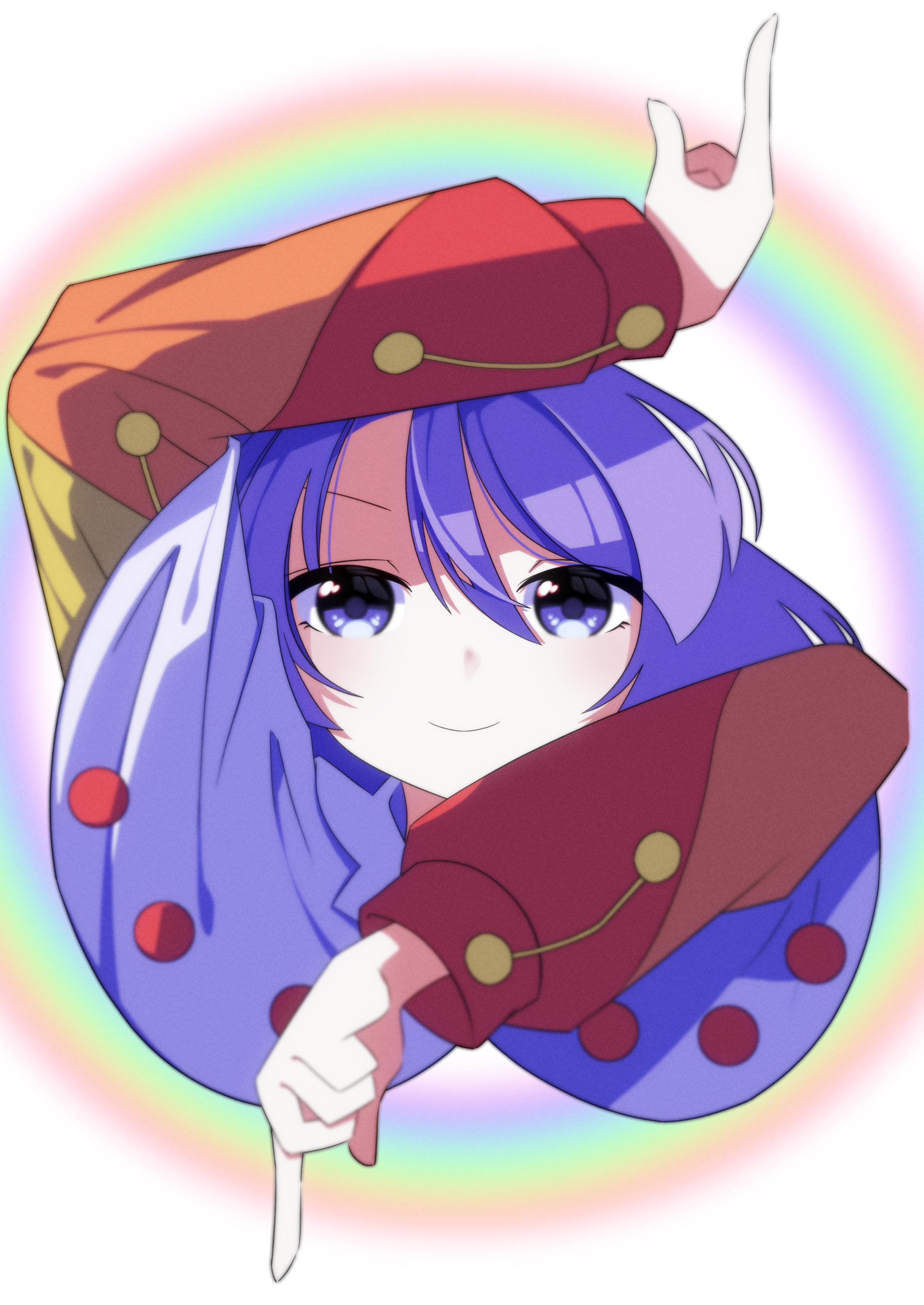 1girl absurdres closed_mouth commentary_request cropped_torso hair_between_eyes highres long_sleeves looking_at_viewer multicolored_clothes portrait pose_request purple_eyes purple_hair rainbow shishidonagi short_hair simple_background smile solo straight-on tenkyuu_chimata touhou white_background