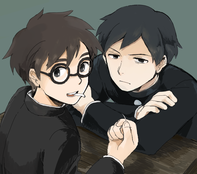 2boys black-framed_eyewear black_eyes black_hair black_jacket brown_hair cigarette closed_mouth commentary_request crossed_arms dashimaki_(konbukahamusuta) expressionless fish_skeleton gakuran glasses green_background holding honjou_kirou horikoshi_jirou jacket kaze_tachinu long_sleeves looking_at_viewer male_focus mouth_hold multiple_boys open_mouth round_eyewear school_uniform short_hair simple_background teeth_hold upper_body