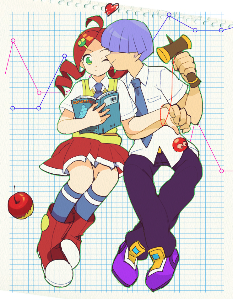 1boy 1girl ahoge andou_ringo apple blue_necktie blue_socks book collared_shirt commentary_request fon-due_(fonfon) food fruit green_eyes hair_over_eyes heart hetero holding holding_book kendama kiss kissing_cheek necktie one_eye_closed pants pleated_skirt purple_hair purple_pants puyopuyo puyopuyo_7 red_footwear red_skirt sasaki_maguro shirt skirt socks sweater_vest white_shirt yellow_sweater_vest