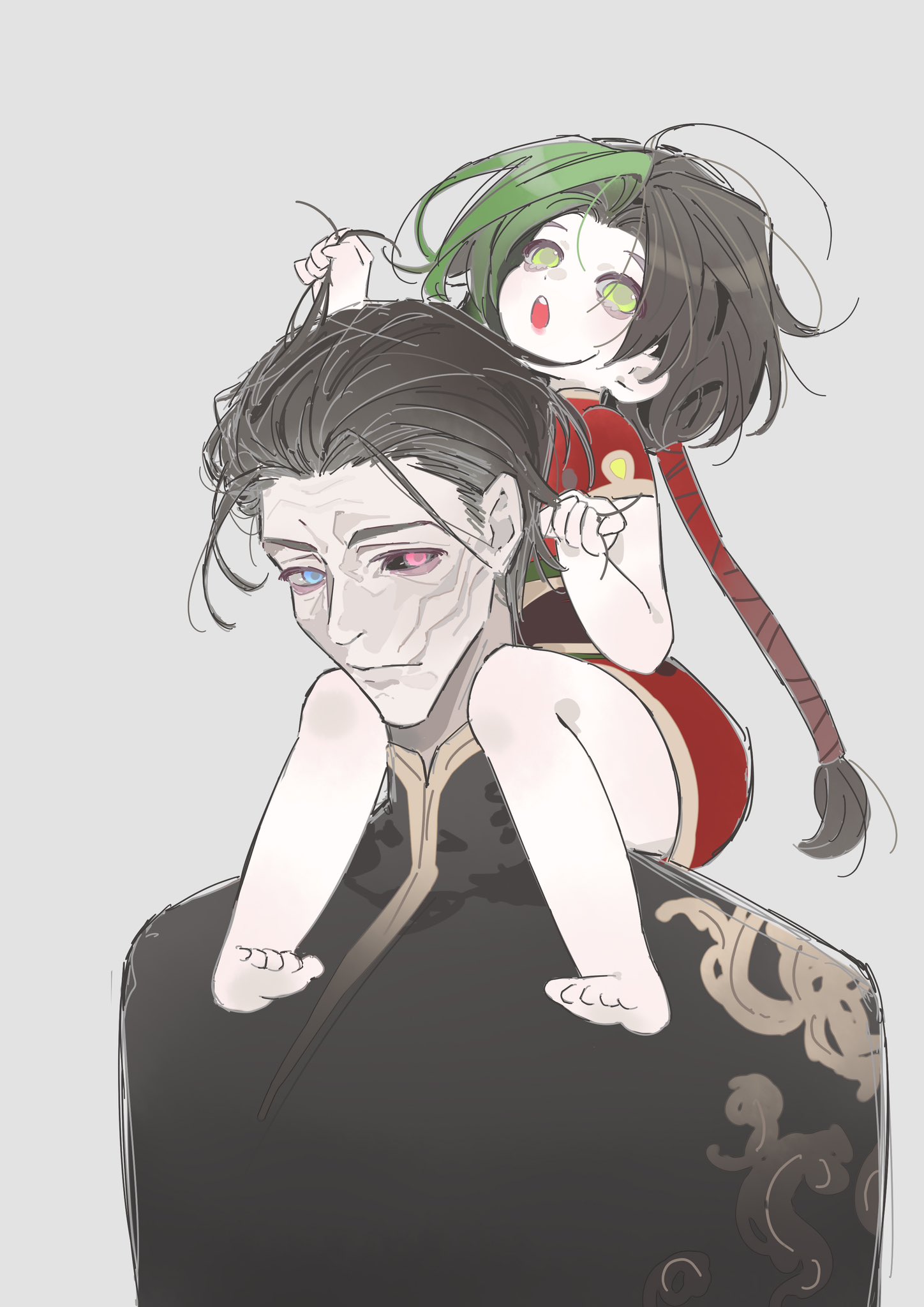 1boy 1girl aged_down bare_arms bare_legs barefoot bity3155660241 black_hair black_sclera black_shirt blue_eyes child china_dress chinese_clothes closed_mouth collared_shirt colored_sclera dress expressionless full_body grabbing_another's_hair green_hair grey_background heterochromia high_collar highres holding_another's_hair jinx_(league_of_legends) league_of_legends long_hair low_ponytail mismatched_sclera multicolored_hair open_mouth pink_eyes ponytail red_dress red_sleeves scar scar_on_face shirt short_dress short_hair short_sleeves silco_(arcane) simple_background sitting_on_shoulder streaked_hair teeth toes upper_body upper_teeth_only very_long_hair wrinkled_skin