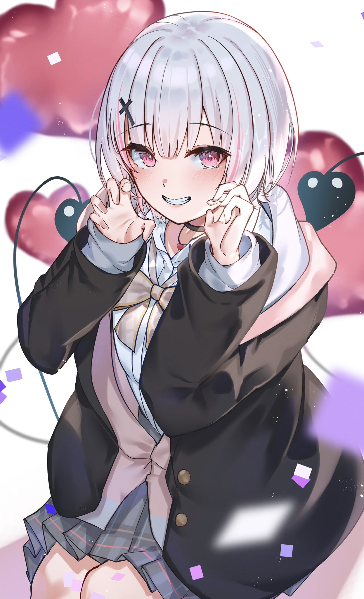 1girl asumi_sena asumi_sena_(4th_costume) balloon black_choker black_coat blush choker claw_pose coat demon_tail grey_hair grin hair_ornament heart_balloon highres jacket long_sleeves looking_at_viewer miniskirt multicolored_hair open_clothes open_jacket pink_eyes pink_hair pink_jacket ringozeri school_uniform shirt short_hair sitting skirt smile solo streaked_hair tail virtual_youtuber vspo! white_shirt