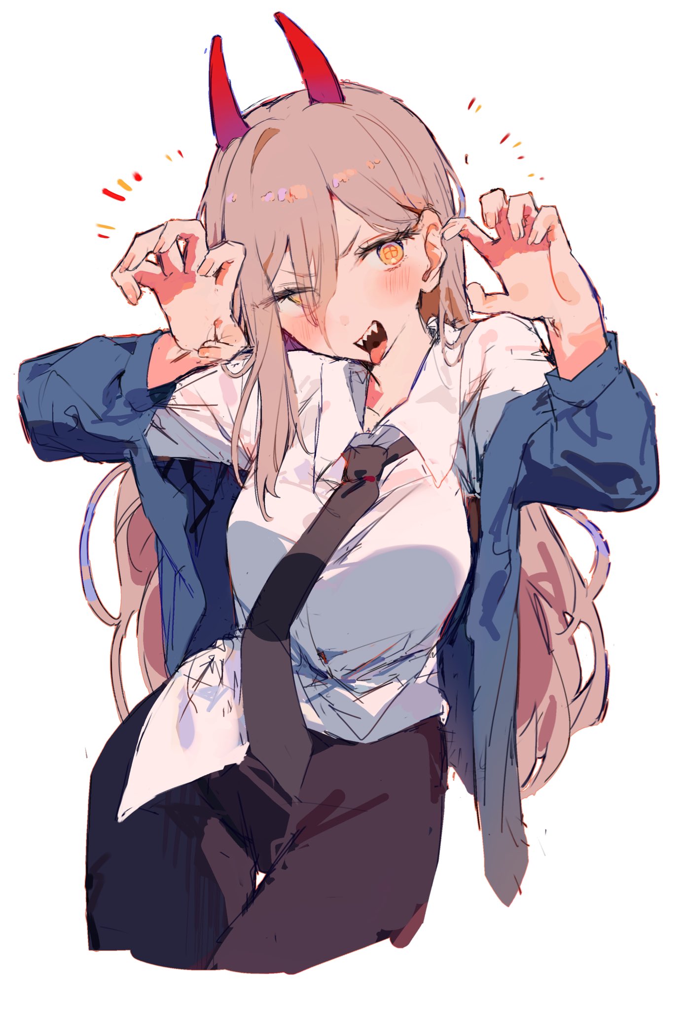 black_necktie black_pants blonde_hair blue_jacket blush bunchi chainsaw_man collared_shirt cowboy_shot cross-shaped_pupils demon_girl demon_horns hands_up highres horns jacket long_hair necktie open_mouth pants power_(chainsaw_man) red_horns sharp_teeth shirt shirt_partially_tucked_in simple_background solo symbol-shaped_pupils teeth tongue tongue_out white_background white_shirt yellow_eyes