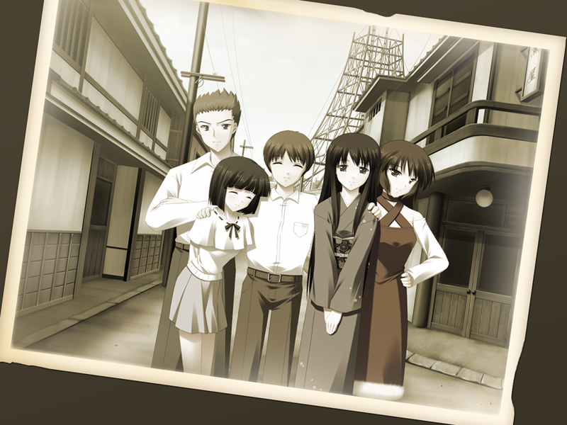 2boys 3girls ^_^ akasen_gairo_~shouwa_33_nen_no_hatsuyuki~ black_eyes black_hair brown_hair closed_eyes dress game_cg greyscale group_picture hand_on_another's_shoulder japanese_clothes karazaki_shizue kimono kisaragi_masayuki kisugi_chihiro long_hair monochrome multiple_boys multiple_girls okonogi_fuuka outdoors photo_(medium) purple_kimono ryoumoto_ken smile watari_suguru