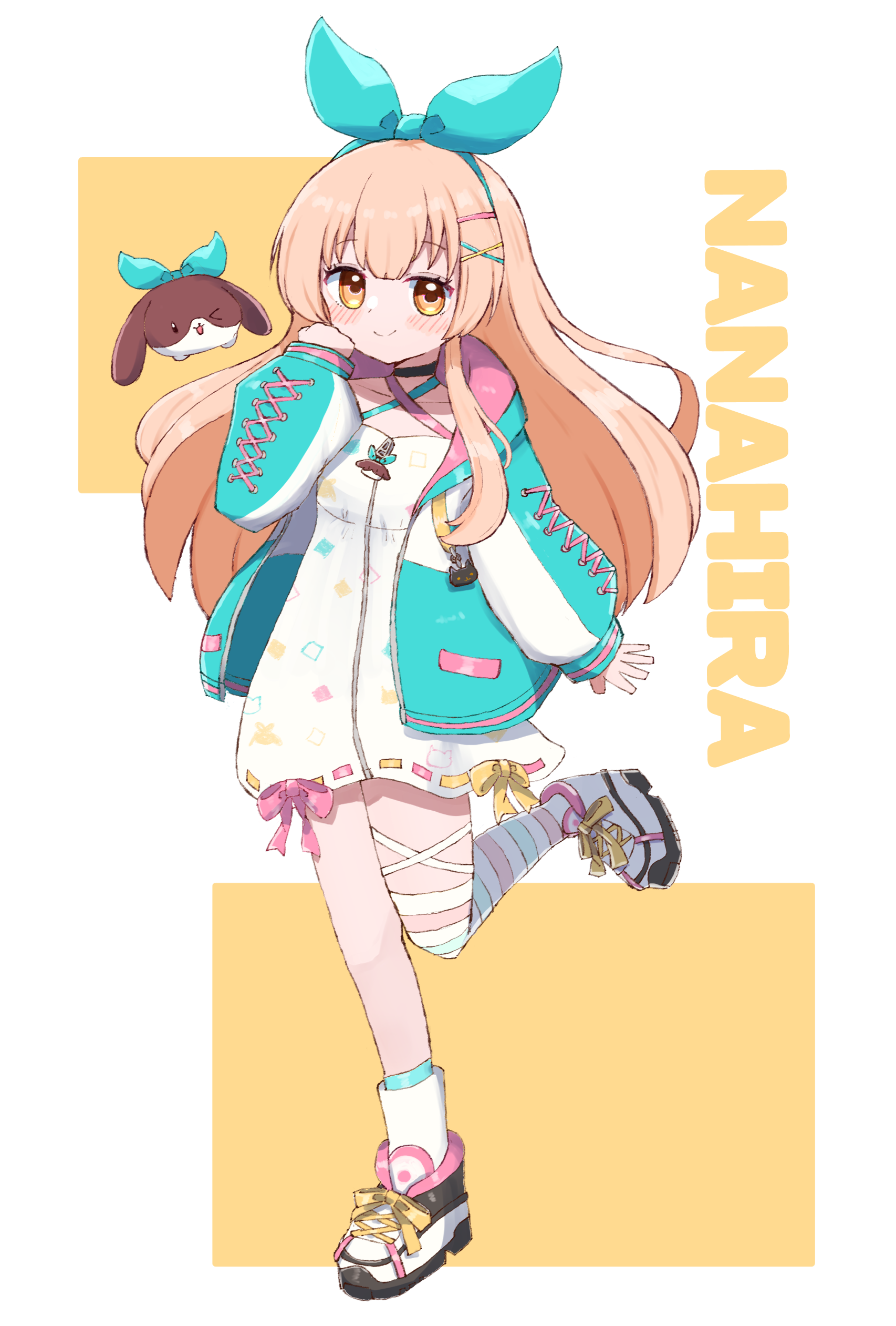 1girl absurdres aqua_bow aqua_hairband aqua_hoodie bebe_(nanahira) blonde_hair blush bow bow_hairband character_name closed_mouth dress full_body hair_ornament hairband hairclip hand_on_own_face highres hood hoodie indie_utaite long_hair long_sleeves looking_at_viewer nanahira puffy_sleeves rabbit ribbon-trimmed_dress ribbon_trim sasugane_watashi simple_background smile solo standing standing_on_one_leg tachi-e white_dress yellow_eyes zipper_dress