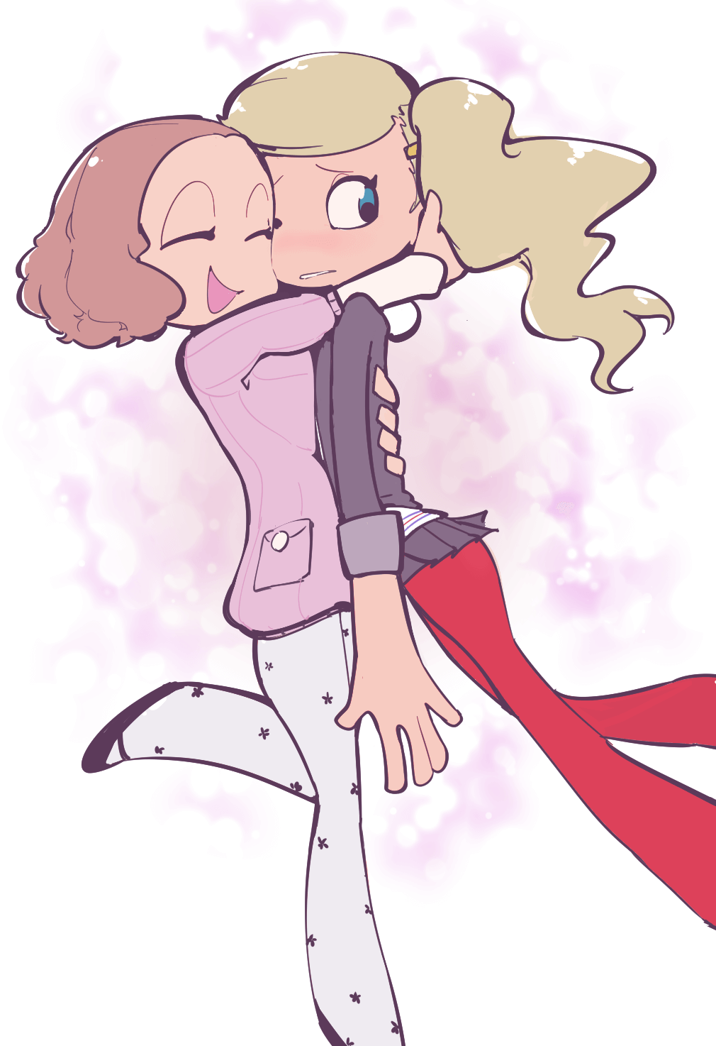 2girls blonde_hair blush brown_hair coat highres hug multiple_girls okumura_haru open_mouth pants persona persona_5 persona_5_tactica plow_(witch_parfait) skirt slippers smile sweater takamaki_anne
