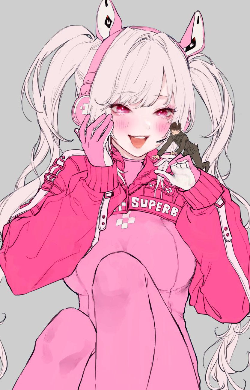 1boy 1girl :d alice_(nikke) animal_ear_headphones animal_ears blush bodysuit breasts commander_(nikke) covered_navel cropped_jacket fake_animal_ears gloves goddess_of_victory:_nikke grey_hair hair_between_eyes headphones headset highres impossible_bodysuit impossible_clothes jacket latex latex_bodysuit long_hair medium_breasts mini_person miniboy open_mouth pink_bodysuit pink_eyes pink_gloves red_jacket shoes sidelocks skin_tight smile sneakers twintails two-tone_gloves white_gloves yonaka_(my0nk)