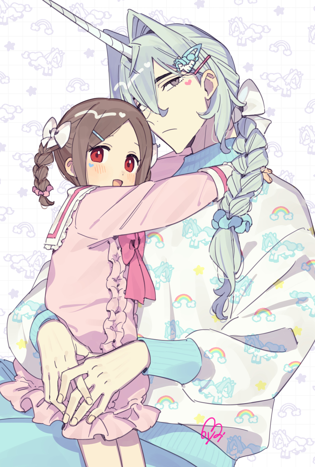 1boy 1girl age_difference blue_hair blush bow bowtie braid brown_hair commentary couple dress grey_eyes hair_ornament hairclip heart heart_sticker hetero highres horns hug light_blue_hair lily_(moyori) long_hair moyori open_mouth original pink_dress print_sweater red_eyes short_hair single_horn smile sticker sweater untranslatable_commentary twin_braids unicorn_(moyori) unicorn_hair_ornament unicorn_print